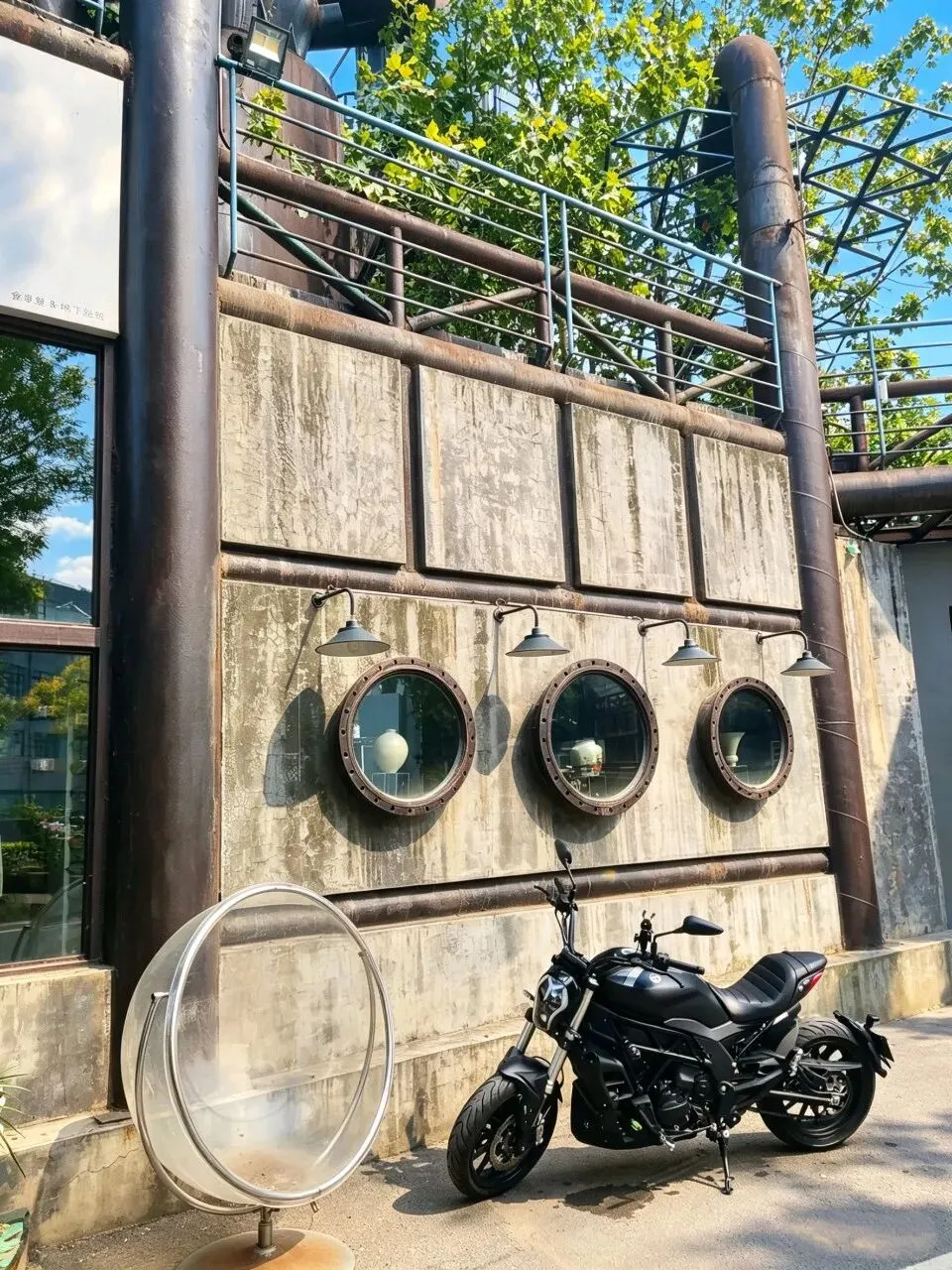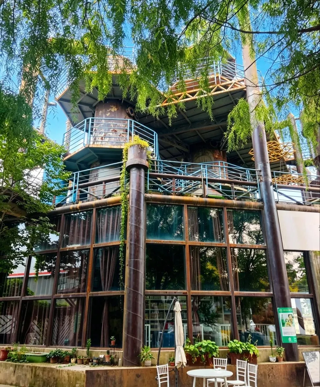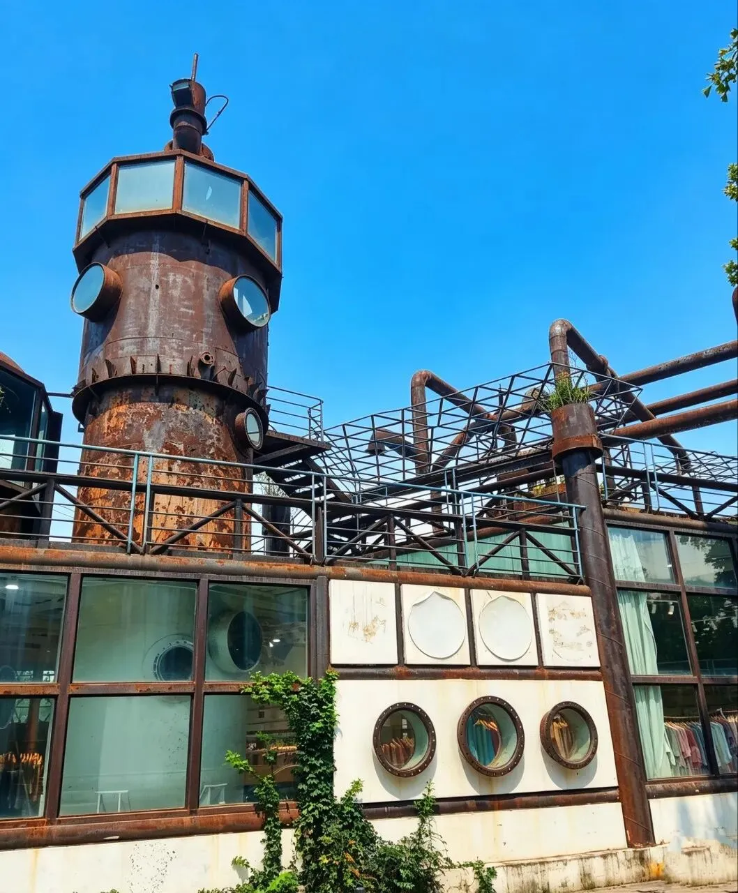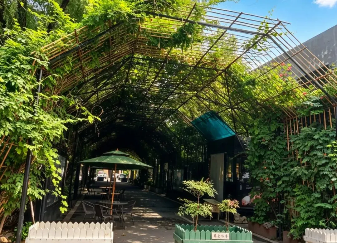 园区的前身是石家庄双联化工厂,随着城市产业升级,这座老旧化工厂逐渐荒废闲置。后来,本土原创皮具品牌“食草堂”将这片厂区改造为集艺术、文创、旅游于一体的特色园区,改造全程采用无图纸艺术化设计,完整保留了化工厂原有的建筑格局、工业骨骼与空间生态,使其成为石家庄工业遗产活化的代表性项目,成为本地文化创意与休闲旅游的重要地标。 图中建筑上方的标语“自然的 世界的 你的 我的”,是食草堂艺术园区的核心文化Slogan,完美诠释了该园区从老旧化工厂蜕变而来的艺术理念。 绿植长廊