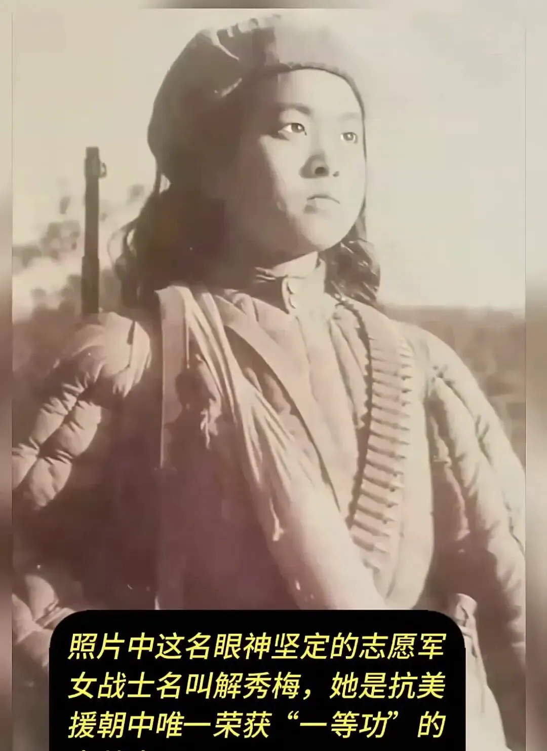 说解秀梅,年轻时一条麻花辫,干净清爽的脸,照片上看得出精神气实在足,军装领子立得板板正正,袖口补丁都摁得严严实实,谁能想到这姑娘能顶上志愿军一等功勋章,还让彭德怀司令亲自给她戴奖章,战场血火里走出来的人,回家就混在老百姓的队里,一辈子不露声色。