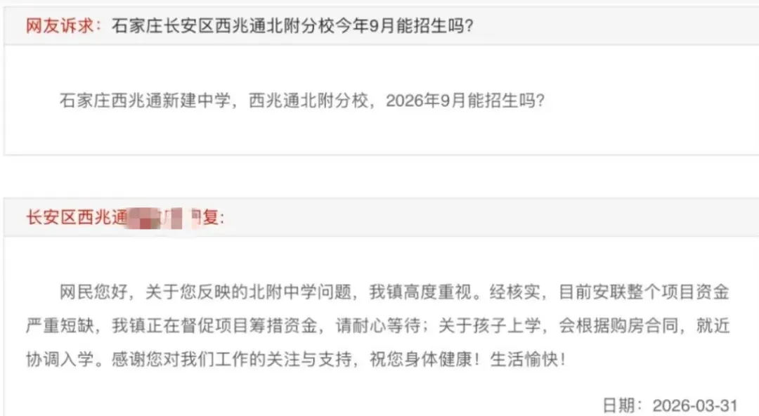 北附学校西兆通分校:规划10轨制30个班,原定26年9月投用,从25年11月就基本停工,主体已经完成。官方回复:由于安联资金严重短缺,正在积极督导筹措资金。今年入学学生按购房合同协调上学,大家做好最坏准备,得就近调剂入学。
