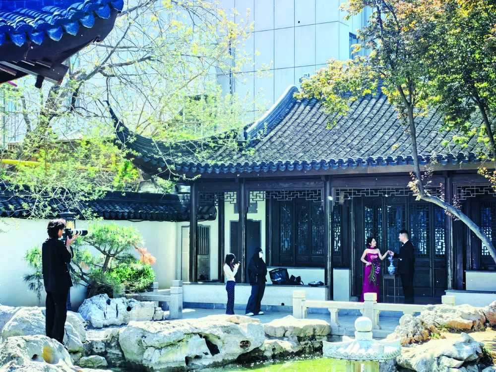 青砖、黛瓦、白墙,小桥流水、假山叠石,裕园处处是江南园林的诗情画意。春日的裕园,更添了几分温柔与浪漫。一对对新人身着华美婚服,在这座古典的园林里留下人生中最珍贵的影像。他们或立于青砖墙前,或倚于水榭之畔,一颦一笑皆与园中景致相映成趣。“这里满足了我对江南的所有想象。穿梭在亭台楼榭间,仿佛真的穿越了时光。”正在拍摄婚纱照的陈女士眼中满是憧憬,“所以我把婚纱照选在这里,希望人生最美的照片,能定格在这座最美的园子里。”