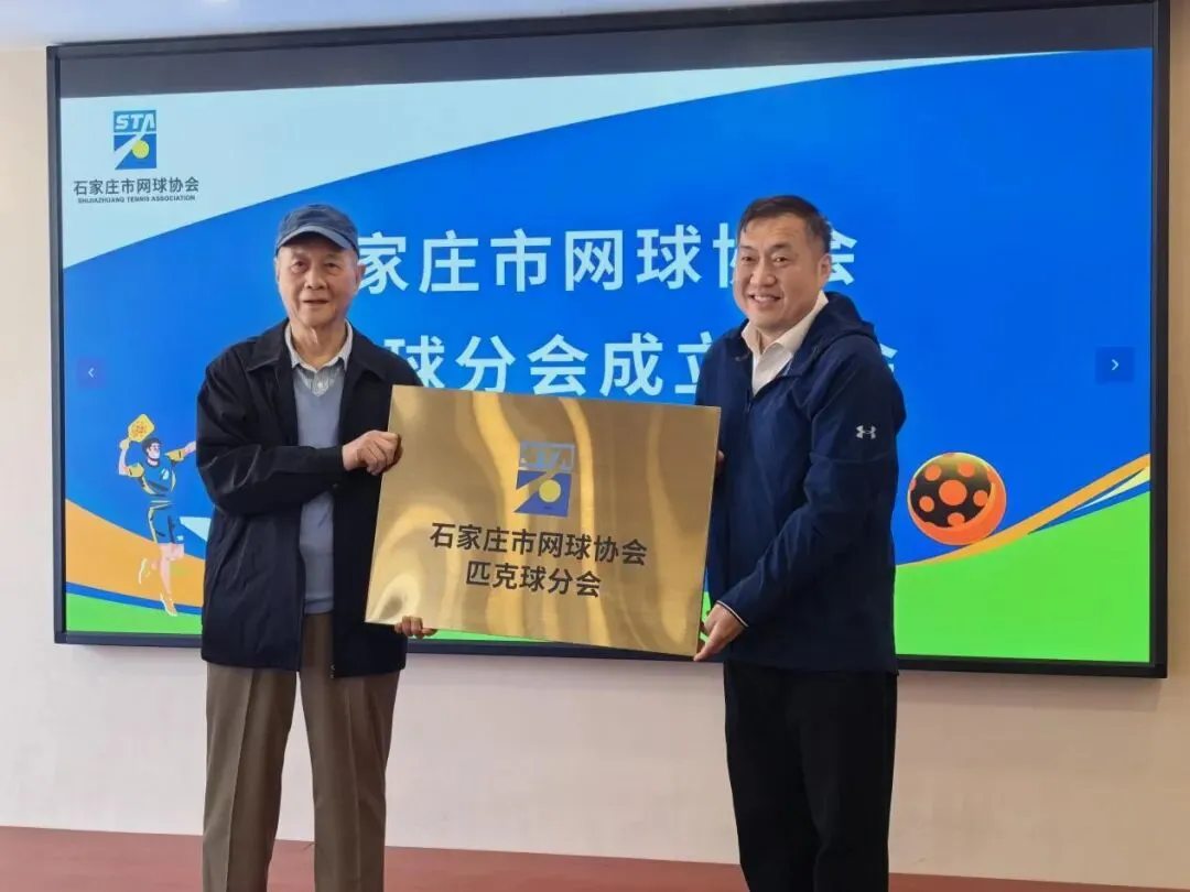 石家庄市网球协会名誉会长李遵英为“石家庄市网球协会匹克球分会”授牌,石家庄市网球协会匹克球分会会长杨兵接牌。标志着该分会组织架构的确立和职能的全面启动。
