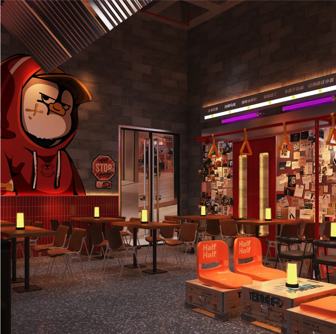冷色调灯光企鹅主题装置水泥灰与活力橙的碰撞