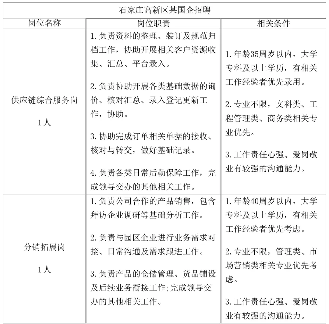 >石家庄市高新区某国企招聘2名工作人员岗位表