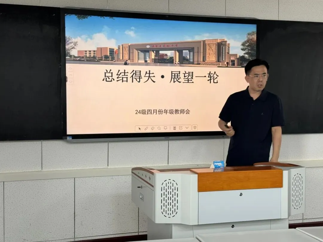 刘明主任全面剖析四月月考成绩,以班级、学科数据为依据,精准查摆知识掌握不牢、答题不规范、课堂落实不到位等问题,引导教师树立科学考试观。他围绕班风建设、尖子生语数外培优、新课与一轮复习衔接部署重点工作,深入解读2026年高考命题导向,强调紧扣课标、回归教材、反套路刷题,并对校园安全、学生管理及工作纪律提出明确要求。