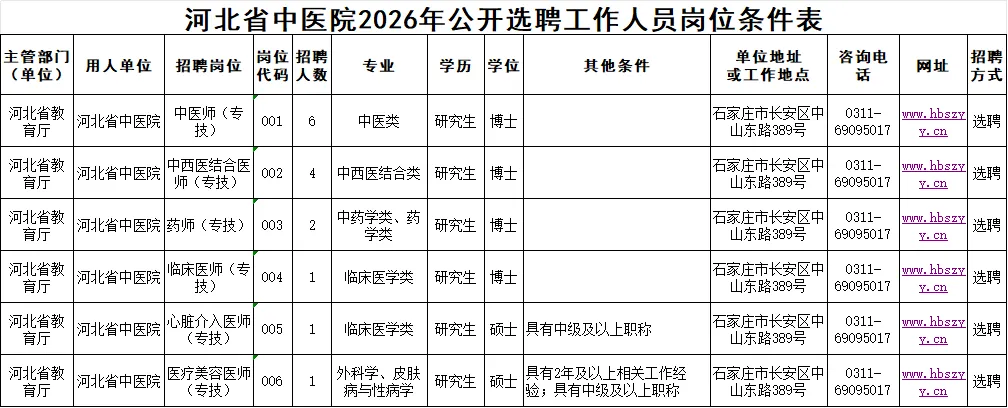 2026年河北省中医院拟公开选聘工作人员15名,其中博士研究生13名,硕士研究生2名,年龄在45周岁以下(1980年4月17日以后出生)。具体要求详见《河北省中医院2026年公开选聘工作人员岗位条件表》(附件1)。遵循“择优原则”,招聘人员数量可少于或等于公告发布人员数量。其中专业参考教育部《授予博士、硕士学位和培养研究生的学科、专业目录》《普通高等学校本科专业目录》《普通高等学校高职高专专业参考目录(试行)》等设置。