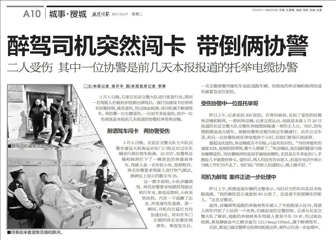 更令人没想到的是,就在“托举电缆”报道刊出仅7天后,焦亚楠又一次成了新闻主角。2017年3月7日,本报A10版刊发《醉驾司机突然闯卡 带倒俩协警》——当年3月5日晚,长安交管大队开展夜查。22时许,辅警焦亚楠和韩冽拦下一辆黑色商务车。驾驶人是一名年轻小伙,吹气测试显示他涉嫌酒驾。正当两人要求其出示驾驶证和行驶本时,小伙突然猛打方向盘、加速驶离,将站在车门左侧的焦亚楠和韩冽当场带倒。