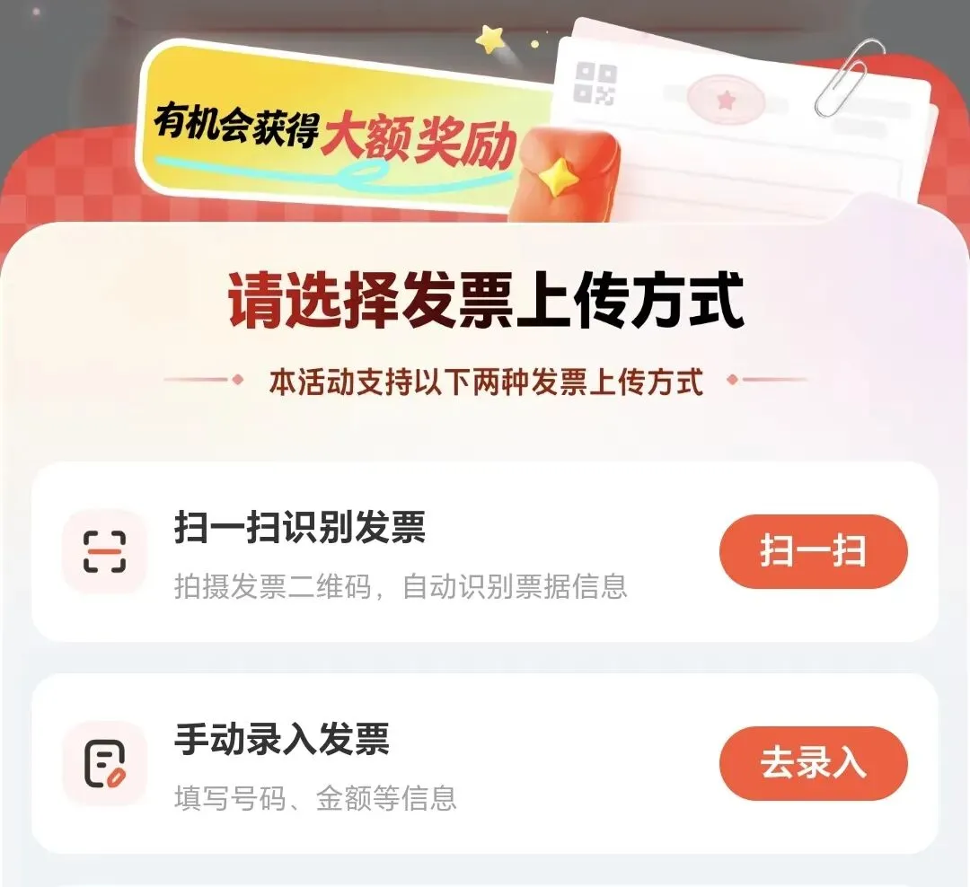 进入活动后,你可以根据自己的习惯,选择以下两种方式上传发票: