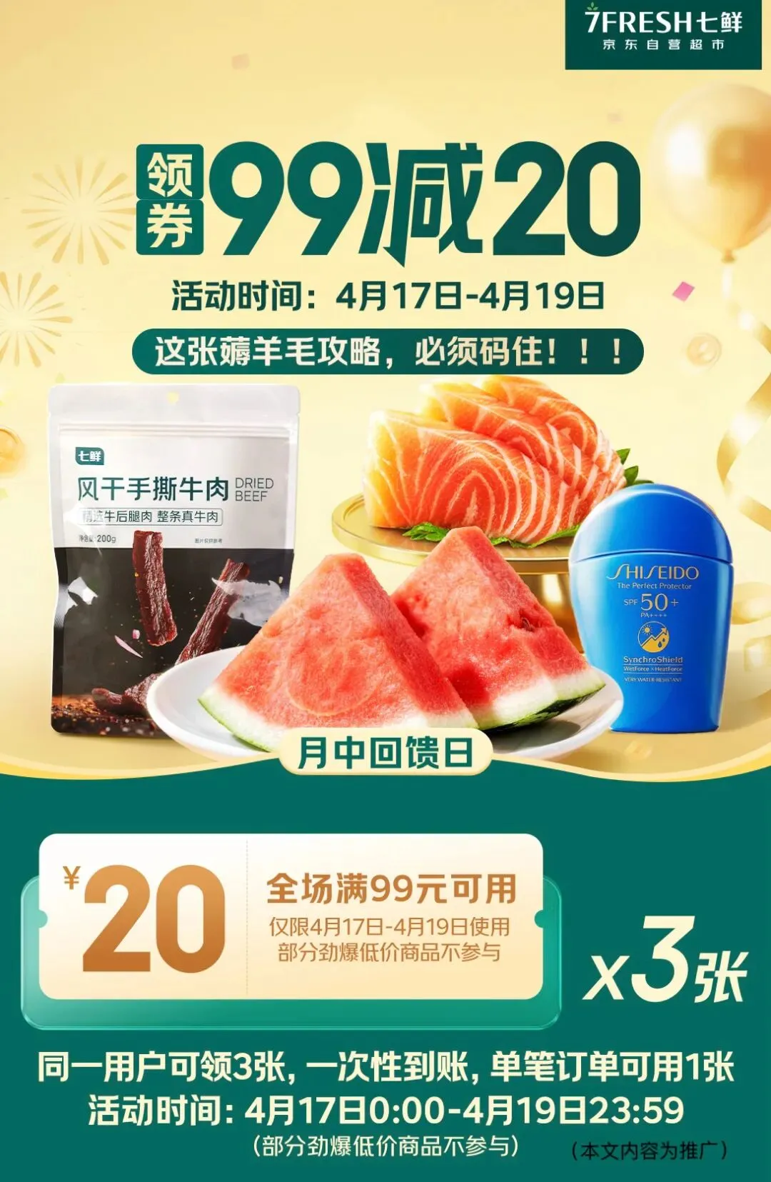 好消息!4月17日至4月19日,京东七鲜超市“月中回馈日”再次启动,石家庄全城线上线下同步推出全场满99元减20元优惠,不用凑单、不用算券,可以满足市民生鲜采购、美食尝鲜、轻食减脂等多元需求。