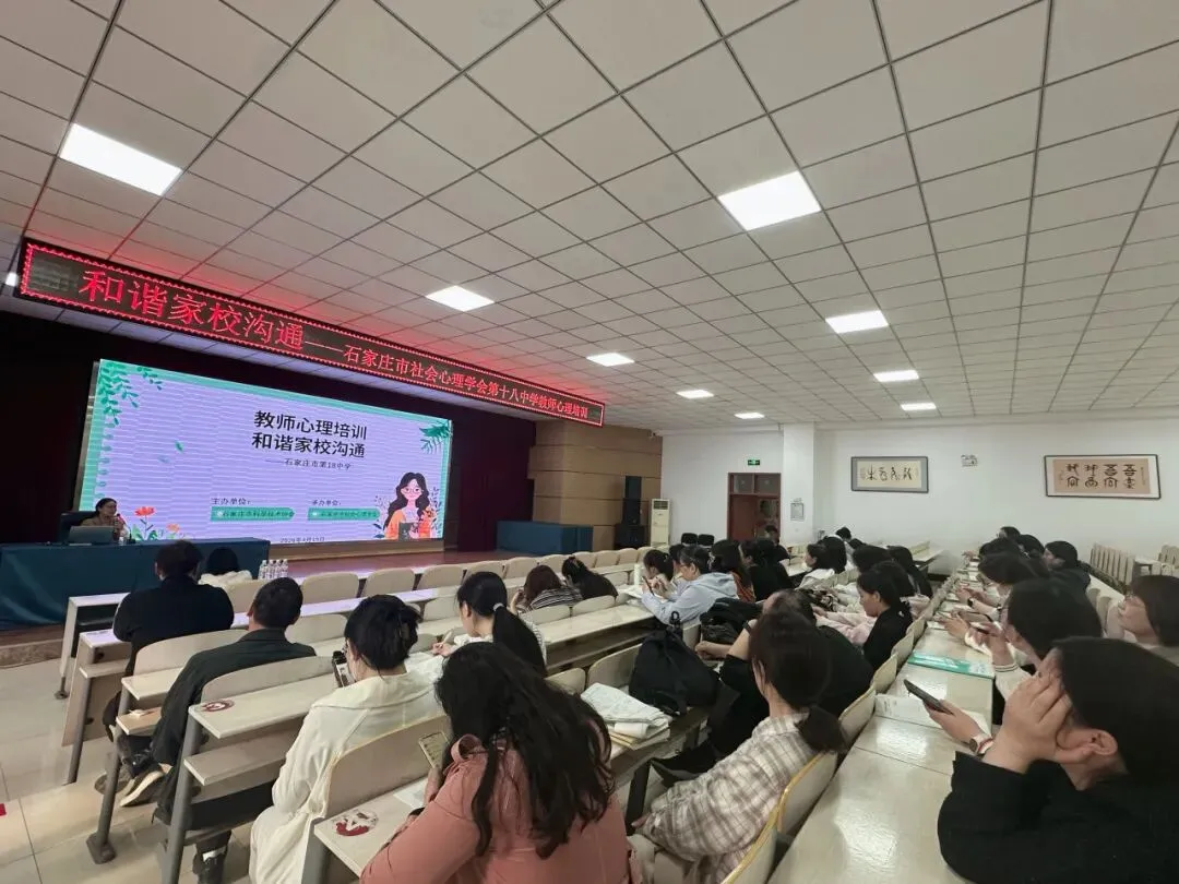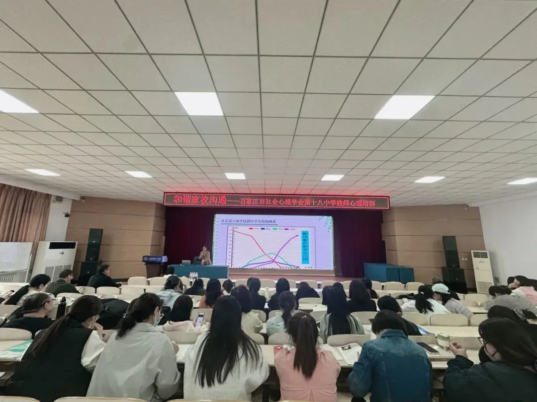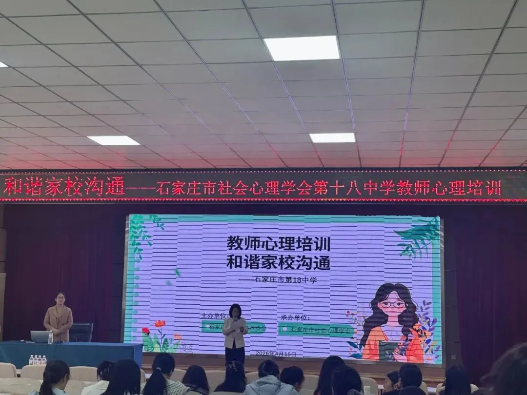 2026年4月15日,石家庄市社会心理学会依托科技工作者之家平台,为石家庄市第十八中学的教师举办了教育心理学科普讲座,本次讲座由石家庄市社会心理学会副会长郝志英担任主讲。此次讲座的目的在于提高教师群体的心理健康素养以及家校沟通实践能力,助力教师群体妥善应对教学压力、学生管理、家校沟通等多方面的挑战。