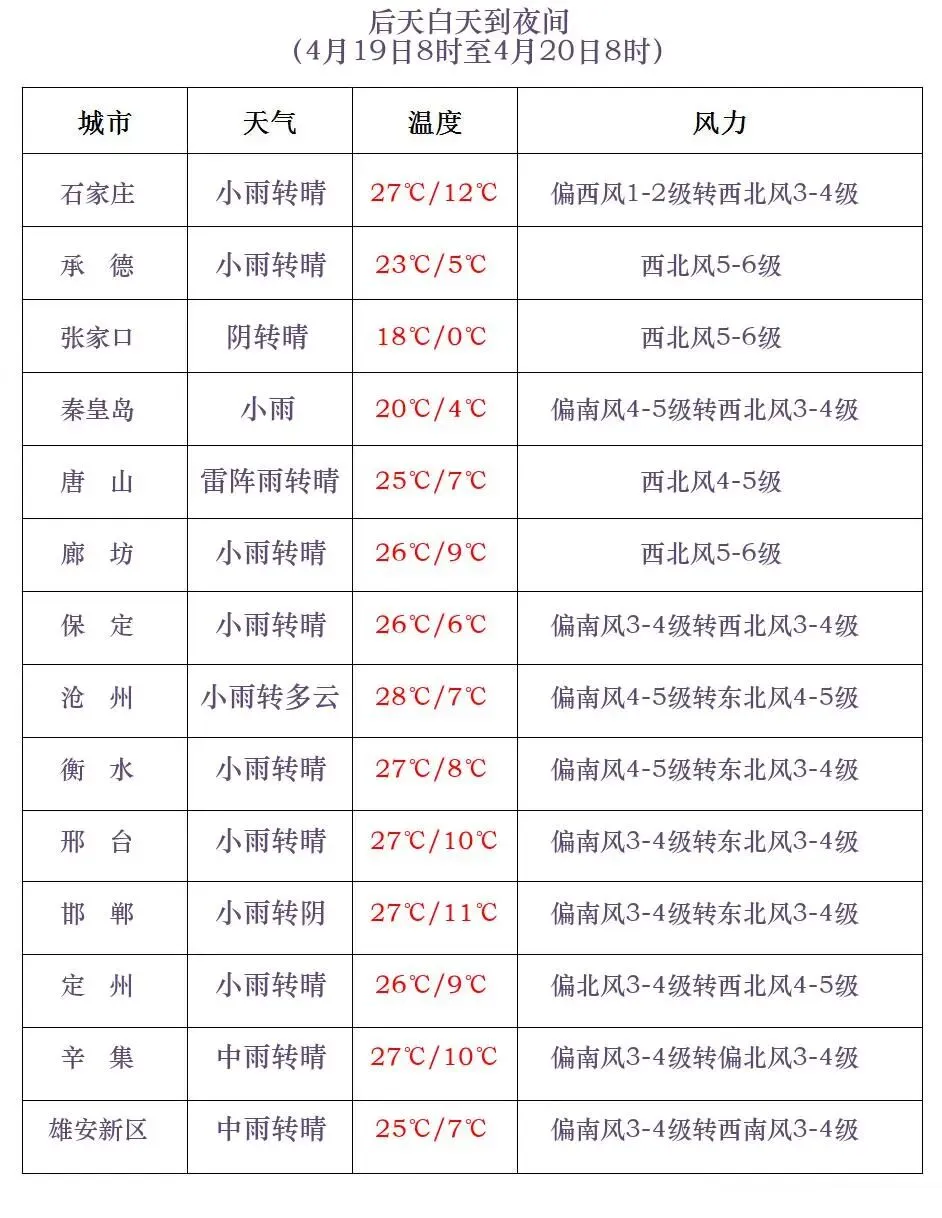 19日白天到夜间,石家庄、沧州以北地区有西北风5到6级,阵风7到8级,局地可达9到11级,其他地区有偏南风转偏北风4到5级,阵风6到7级,全省大部分地区伴有扬沙或浮尘天气;渤海海域和沿海地区有偏北风5到7级,阵风8到10级。