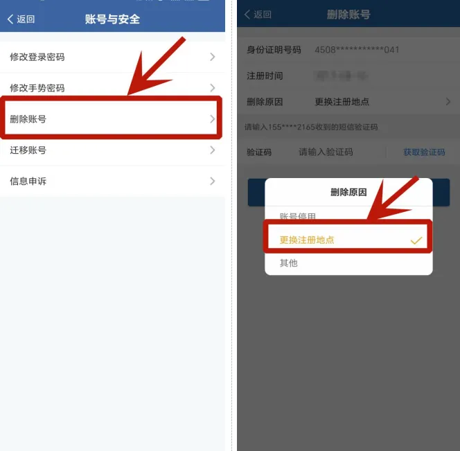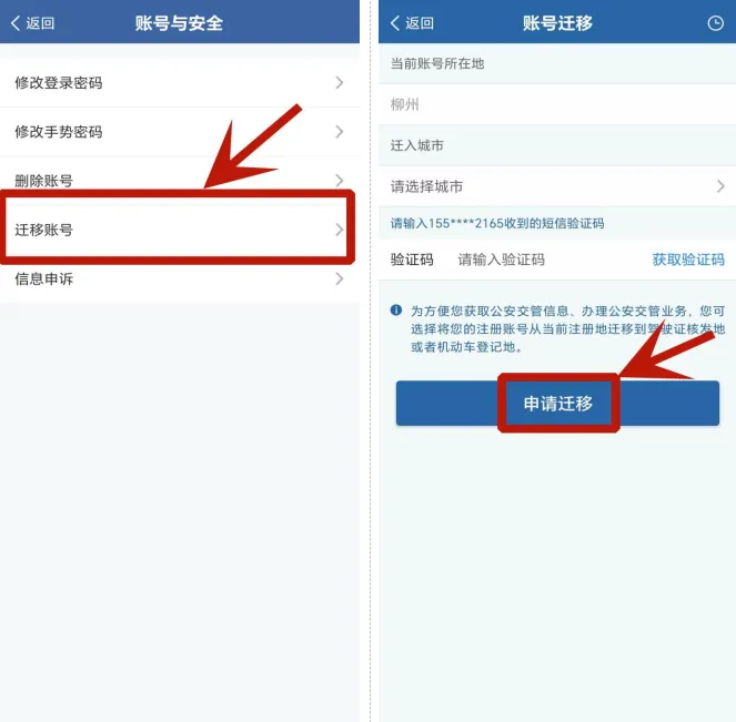申请人登录“交管12123”APP后,在首页,点击“我的”进入“账号与安全”,申请人可以通过“删除账户”和“账号迁移”两种方式进行更新。