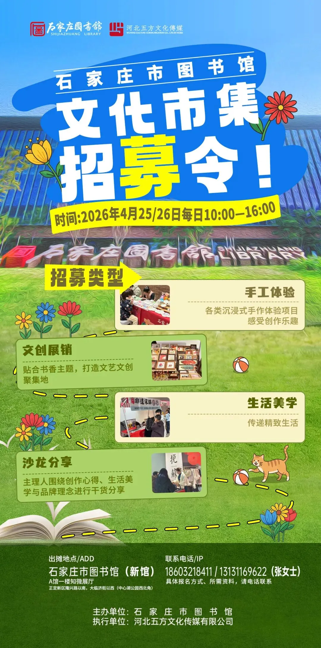 邮件标题请标注:【石家庄市图书馆文化市集申请】-品类-品牌名/姓名