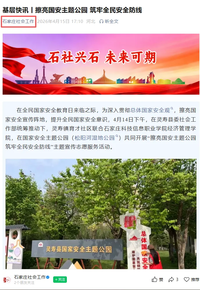 在第11个全民国家安全教育日来临之际,为深入贯彻总体国家安全观,推动国家安全宣传教育走深走实,经济管理学院联合灵寿县委社会工作部、灵寿镇育才社区,于4月14日下午在灵寿县国家安全主题公园(松阳河湿地公园),共同开展“擦亮国安主题公园 筑牢全民安全防线”主题宣传志愿服务活动。此次活动成效显著,相关内容获石家庄社会工作官方平台专题报道,进一步扩大了活动的社会影响力与辐射面。