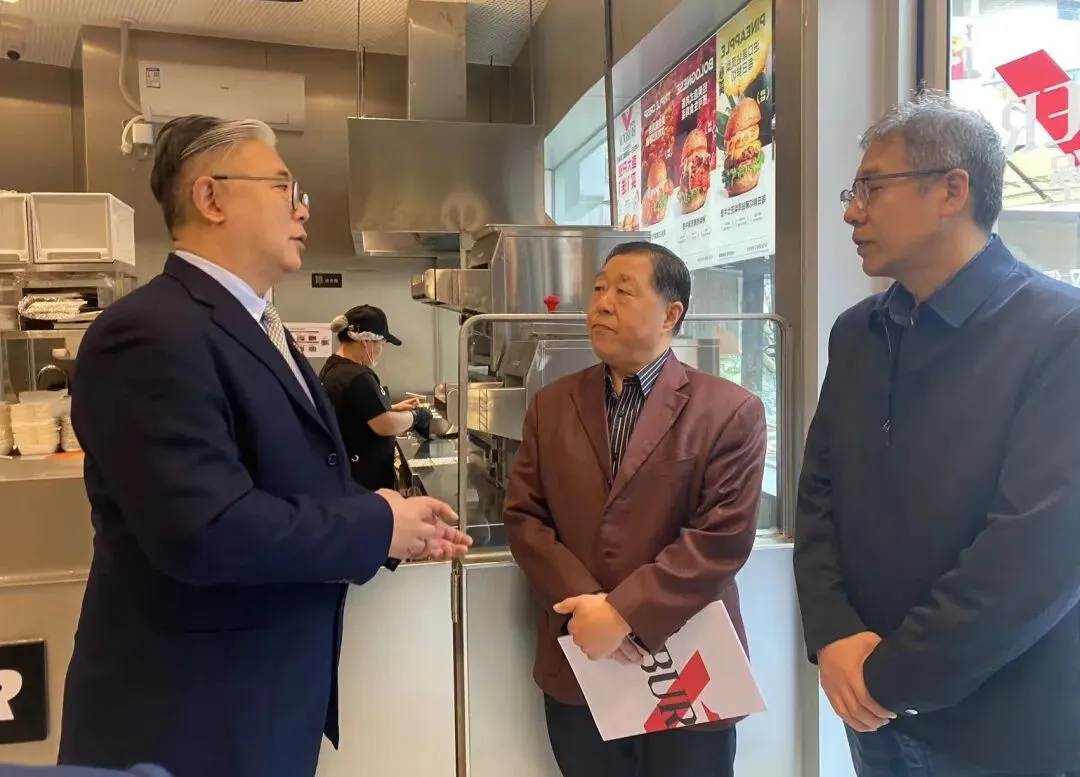 市促饭协书记、会长李位忠(中)与必胜客和商务局领导交流必胜汉堡市场营销情况