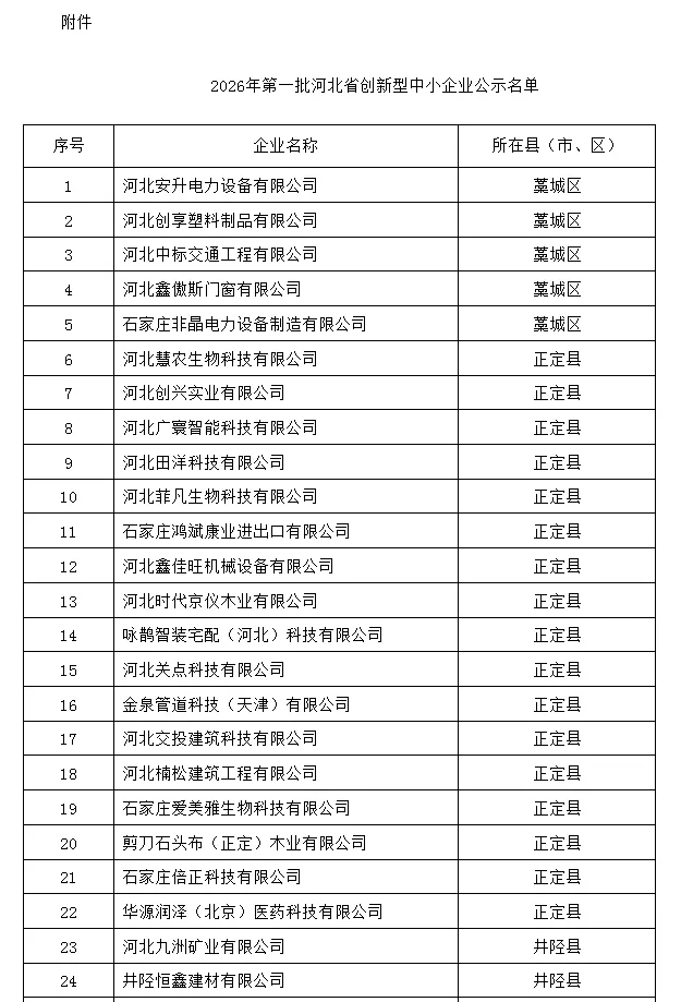 关于拟推荐2026年第一批河北省创新型中小企业名单公示的通知