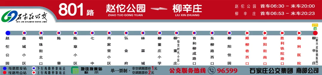 【运行区间】:赵佗公园(首车6:30,末车20:00) ~ 柳辛庄(首车6:53,末车20:23)【票制票价】:单一票制·非空调期票价1元,空调期票价2元;各类免费乘车证卡有效。
