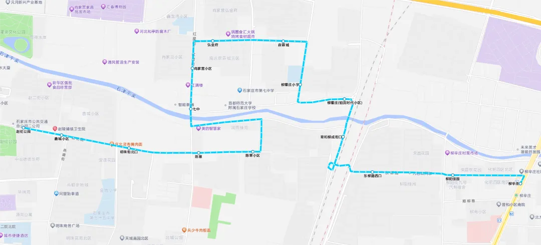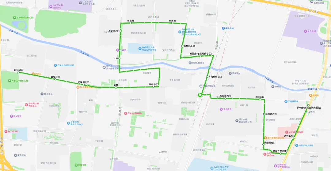 胜利北大街:柳辛庄(新兴皮肤病医院)、胸科医院、铁院北路:胜利铁院北路、柳阳街:柳阳街南口、顺柳巷西口、东柳路:柳阳佳园、东柳路西口、育和街:、育和柳成路口、东垣西路:柳董庄(铂宫时代小区)、柳董庄街:柳董庄小学、志远路:林霖城、弘金府、红星街:肖家营小区、七中、柳成路:、陈章街:、赵佗路:陈章小区、陈章、明珠街北口、鑫城小区、赵佗公园