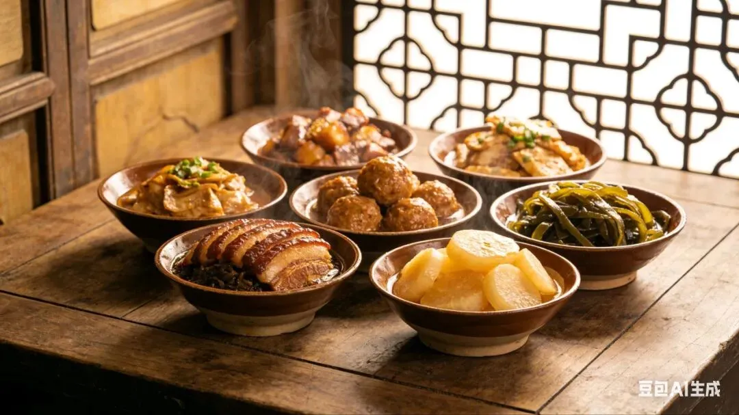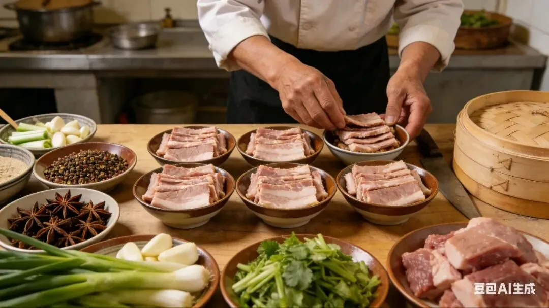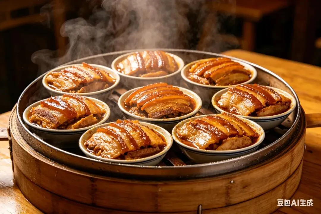 - 方肉:取三肥七瘦的猪肉,切成方正大块,寓意“端方持正”,蒸制后扎实醇厚,饱吸汤汁精华,口感绵密,尽显肉食的本真鲜味。