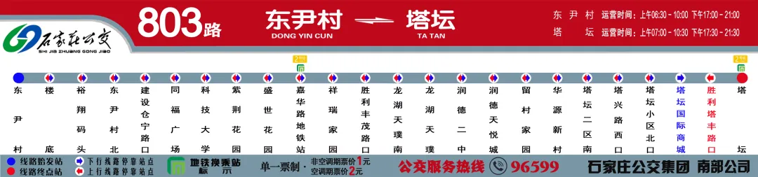 【运行区间】:东尹村(运营时间6:30-10:00/17:00-21:00) ~ 塔坛(运营时间7:00-10:30/17:30-21:30)【票制票价】:单一票制·非空调期票价1元,空调期票价2元;各类免费乘车证卡有效。