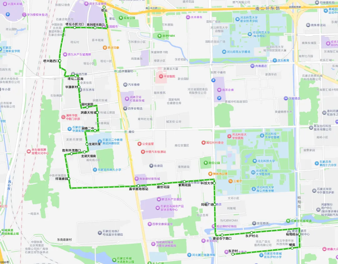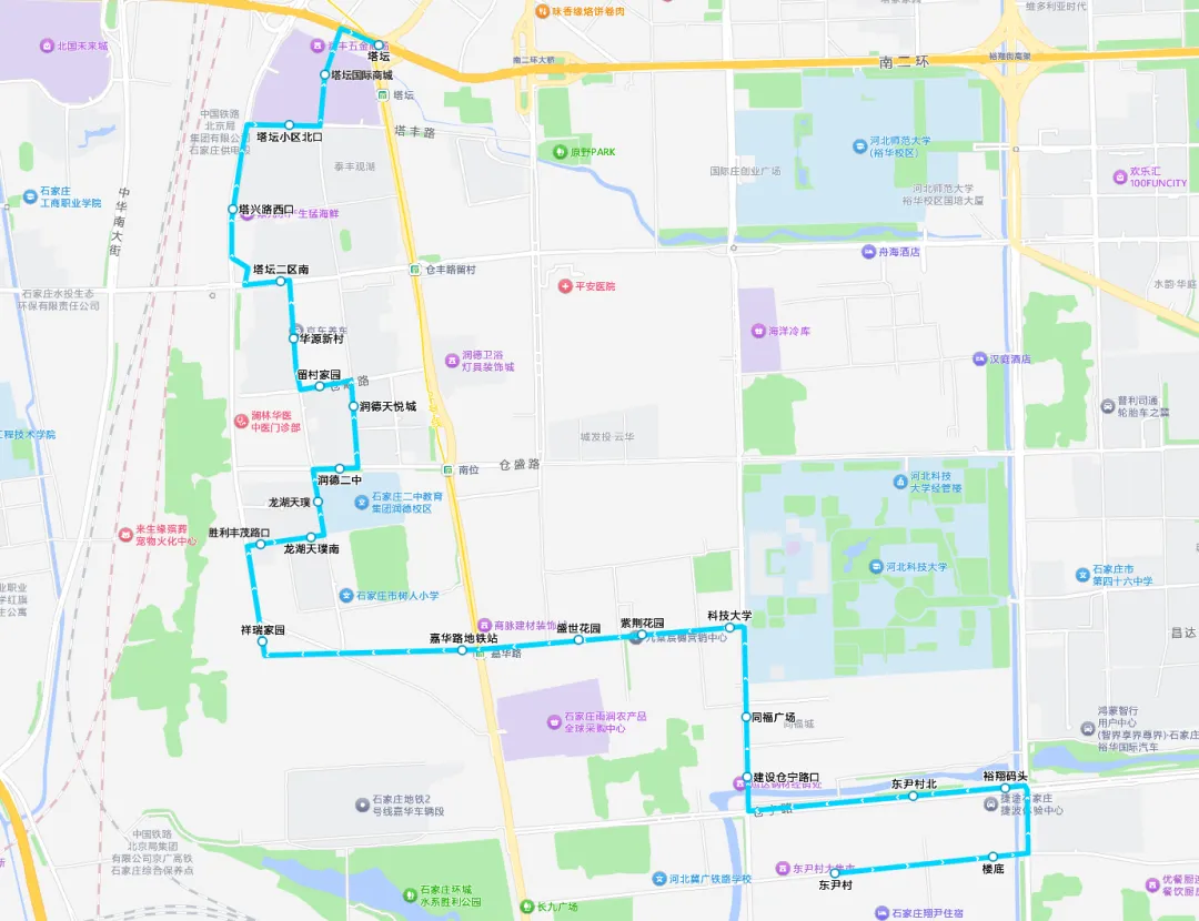 平安南大街:塔坛、塔丰路:胜利塔丰路口、塔坛小区北口、胜利南大街:塔兴路西口、仓丰路:塔坛二区南、留村街:华源新村、仓顺路:留村家园、塔通街:润德天悦城、仓盛路:润德二中、留村街:龙湖天璞、丰茂路:龙湖天璞南、胜利丰茂路口、胜利南大街:祥瑞家园、嘉华路:嘉华路地铁站、盛世花园、紫荆花园、建设南大街:科技大学、同福广场、仓宁路:建设仓宁路口、东尹村北、裕翔街:裕翔码头、段高路:楼底、东尹村