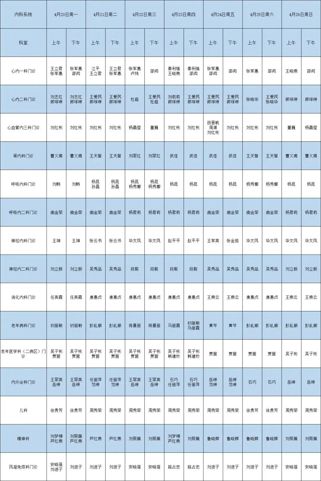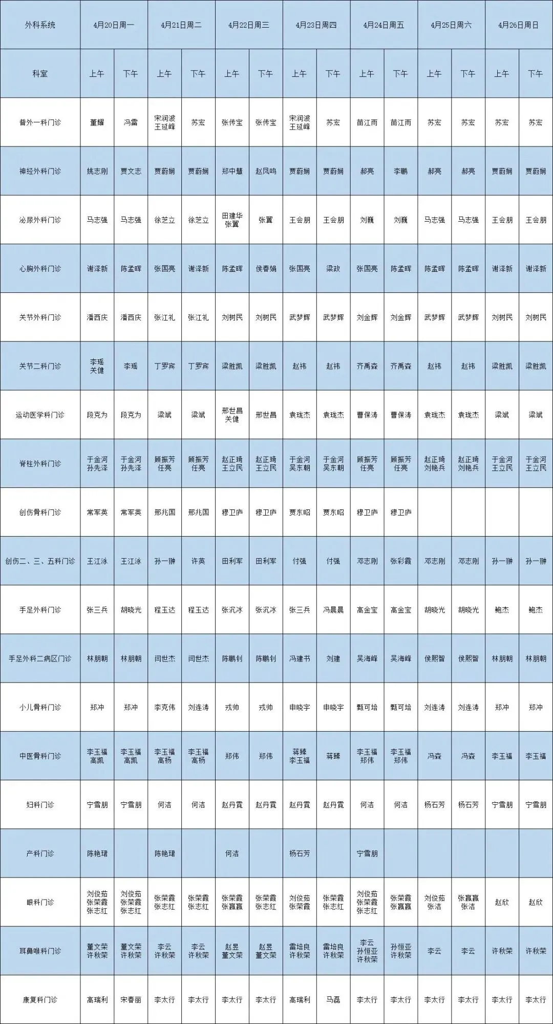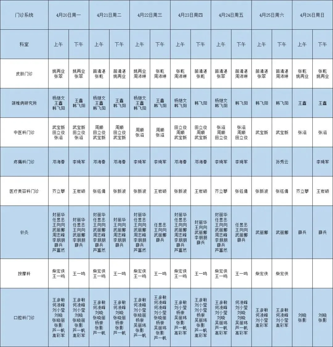 4月20日-4月26日 医师出诊安排如下: