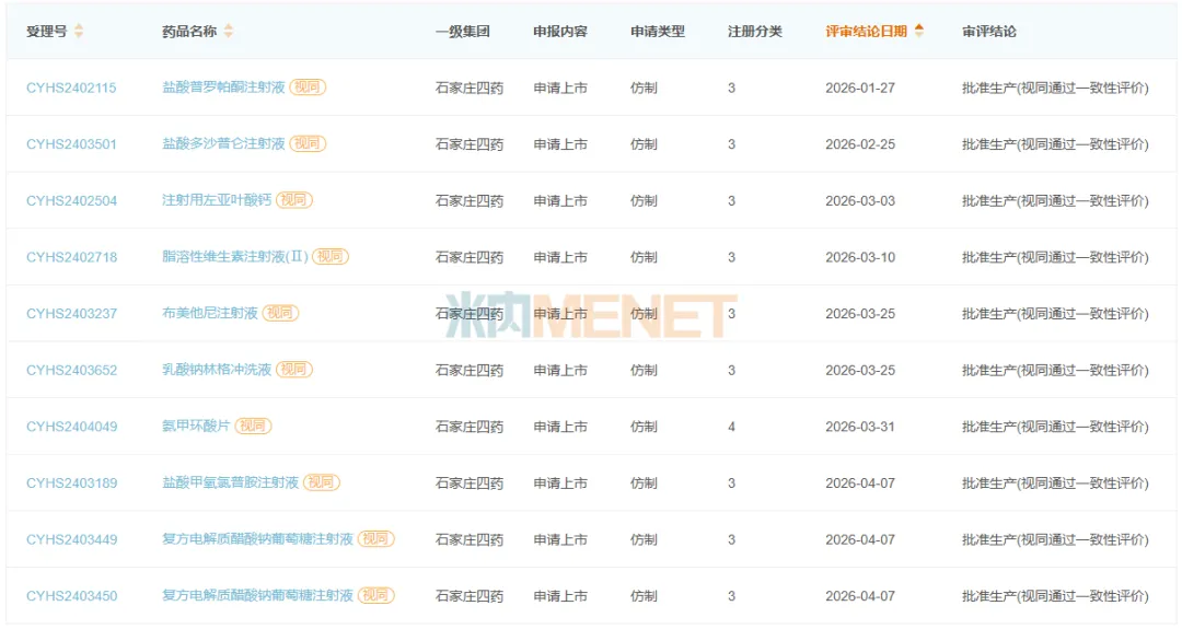 米内网数据显示,2026年至今石家庄四药已累计获批了9个新产品,均为高端仿制药,其中注射剂包括了盐酸普罗帕酮注射液、盐酸多沙普仑注射液、注射用左亚叶酸钙、脂溶性维生素注射液(Ⅱ)、布美他尼注射液、盐酸甲氧氯普胺注射液、复方电解质醋酸钠葡萄糖注射液7个,公司在注射剂领域的研发实力不容小觑。