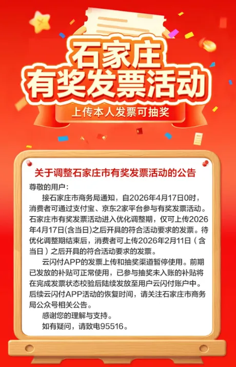 待优化调整期结束后,消费者可上传2026年2月11日(含当日)之后开具的符合活动要求的发票,届时石家庄市商务局将发布相关公告。