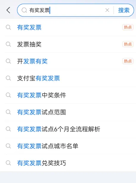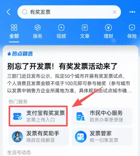 第2步:打开“支付宝”APP,首页搜索“有奖发票”进入活动小程序。