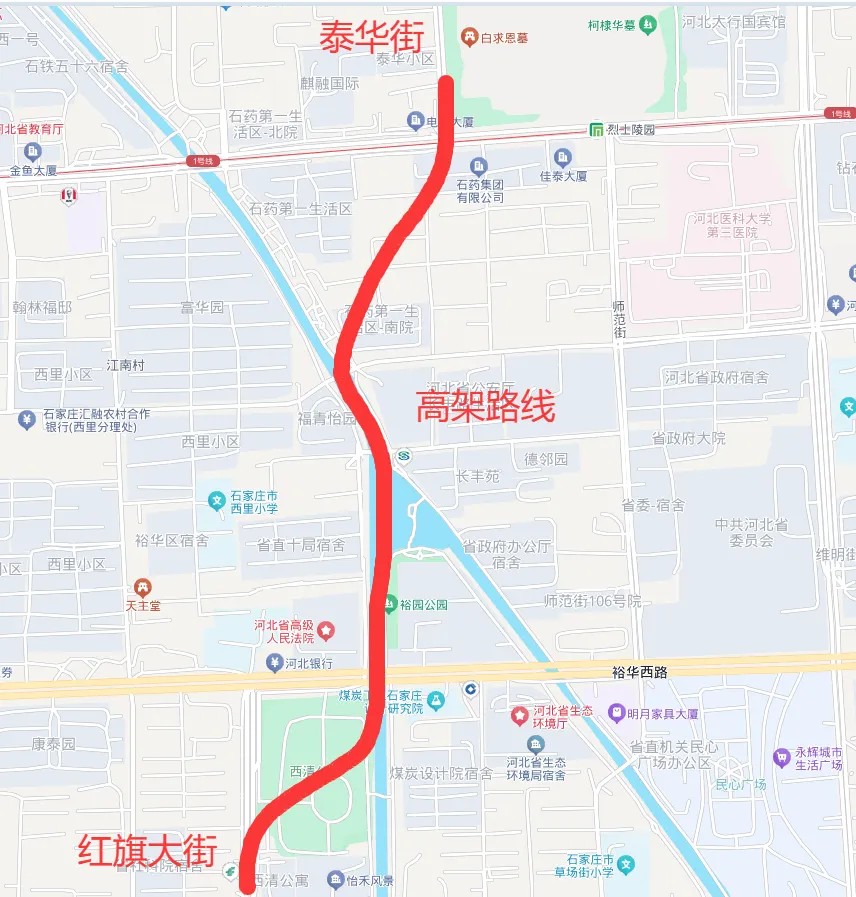 在4月8日,发布的《2025年度中国主要城市交通分析报告》中,石家庄的“交通健康指数”为65.52%,在汽车保有量“超400万辆”的13个城市中排名第二。“路网高峰行程延时指数(高峰拥堵指数)”为1.602,位列全国第三。这份《报告》是由高德地图,联合清华大学土木水利学院、同济大学智能交通运输系统(ITS)研究中心、未来交通与城市计算联合实验室等机构公共发布。其中,“交通健康指数”越高,说明离理想值越近,城市运行相对越健康。从以上可以看到,石家庄确实是最拥堵的城市之一,据统计到2025年底,全市机动车保有量已突破400万辆。石家庄面对机动车高速增长,再加上地铁施工对道路的影响,市区始终坚持“不限行、不限号”政策,方便市民出行。石家庄市通过数智驱动、机制创新与路网完善等方案,使得交通健康指数排名全国第二,成效显著。石家庄城区人口仅有500万左右,在全国城市中连20名也排不进去。但是二环内的人口密度却非常大。在石家庄有句话,出了二环就不是市区了。前几十年,石家庄的城市框架没有拉开,二环一直是这座城市的紧箍咒。大家如果进入石家庄市区,看到大部分居民区都是30多层的高层住宅。这就导致了二环内的居民太多,也导致了各种商业也都集中在二环内,二环内的机动车越来越多,开车肯定拥堵了。另一个因素,就是道路规划。石家庄虽然是新兴城市,但是道路规划没有跟上城市更新的速度。桥西属于老城区,老小区众多,断头路也非常多,有历史因素。桥东属于新城区,在一五期间,已经规划了城市雏形,道路清晰。但是发展过程中,好多道路规划却没有坚持如一。再次,石家庄繁荣于商贸中心,新华集贸,南三条,都位于市中心,这里越来越繁华。导致白天大家都从四周集中到这里,晚上,又从这里分散到四周。近些年,石家庄逐步扩大城市框架,疏通二环内的断头路,逐步解决拥堵问题。说到石家庄道路的改建,桥西急需打通的断头路众多。去年,汇明路和仓丰路实现了贯通。年底,新石北路与华星街的贯通也正在施工,今年应该会竣工通车。其实在好多年以前,官方就有计划把它们两个贯通起来,当时好像是采用地下通道的方案,但是后来也会没有消息了。估计是施工难度大,成本高吧,这些年,全国其他好多城市对于市区道路改建,也采用了一些特别的方式,我们可以参考一下。它们位于中山路与裕华路之间,距离不算很远。而且它们也没有在一条直线上,中间隔着居民区也众多。这些都是客观因素。采用地下通道,成本太高。如果全程高架,越过的居民区又太多。我们可以发现红旗大街东边,泰华街西边,有一条民心河,可以参考东莞的经验,把高架修在民心河上方。以民心河的宽度,双向两车道,还是可以的。沿着民心河到了自强路,可以发现北侧是一处老的6层小区。可以参考贵阳的经验,把高架从小区上方经过,和泰华街连接。这一段高架就是从红旗大街与和裕华路南侧,越过石清公园,到民心河,沿着民心河到自强路口,然后从北侧小区上方经过,向东北和泰华街连接。这样路线,能最大程度的节约了建设成本,又充分合理的利用了本就紧张的土地资源,无疑是一举两得的好方法。