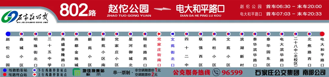 【运行区间】:赵佗公园(首车6:30,末车20:00) ~ 电大和平路口(首车7:03,末车20:33)【票制票价】:单一票制·非空调期票价1元,空调期票价2元;各类免费乘车证卡有效。