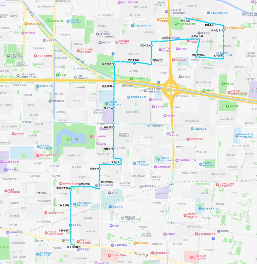 赵佗路:赵佗公园、鑫城小区、明珠街:明珠街北口、三十五中学、誉隆路:燕盛誉隆路口、燕盛街:、新苑路:燕都金地城、新苑小区、誉兴街:新苑小区南、党家庄小区、颐宏路:星河御城北、党家庄街:颐宏路西口、文苑街:文苑街北口、四十二中、联强西区、高柱新村、丰收西路:文苑小区、泰华街:滨湖新村、泰华滨华路口、滨华路:泰华园东区、电大街:电大滨华路口、二十八中(北校区)、北焦路西口、和平西路辅路:电大和平路口