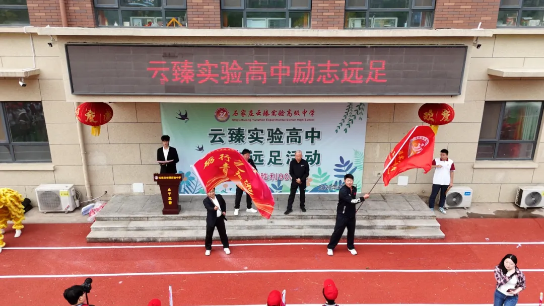 清晨7:00,全体师生整齐列队,心潮澎湃。王建勇校长和谢曙光校长将远足冲锋大旗郑重授予德育主任殷高望和体育老师魏忠舒,台下掌声雷动。