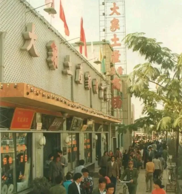 这个中山路商业街就一个字——挤,第一眼是真热闹,招牌挂得满墙跑,大豪土产商场就在这,白天人都扎堆出来逛,橱窗贴满了那个橙色大字的海报,里面最爱逛的其实是小玩意摊,谁还没在这里被大人拉着兜过一圈,“别乱跑啊”,那口气我现在还记得,等有点零钱就自己溜去买冰棍,商场前的树荫底下人等人,一聊就能聊半天,现在商场不少,可没有那味道了。