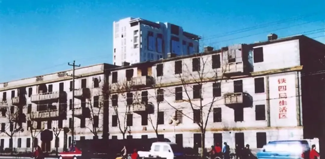 图里这排叫铁四局生活区,房子刷得不花哨,阳台全是一色外飘,楼下有辆白色平头解放,小时候楼道里回声特多,早上天还没亮楼上就“咚咚”踩,阿姨端着菜盆楼下聊天,小孩在院子里骑小三轮追着玩,楼边那片光秃地,春天一阵风能刮出沙子味儿,谁家要是添了彩砖阳台,邻居都得竖个大拇指。