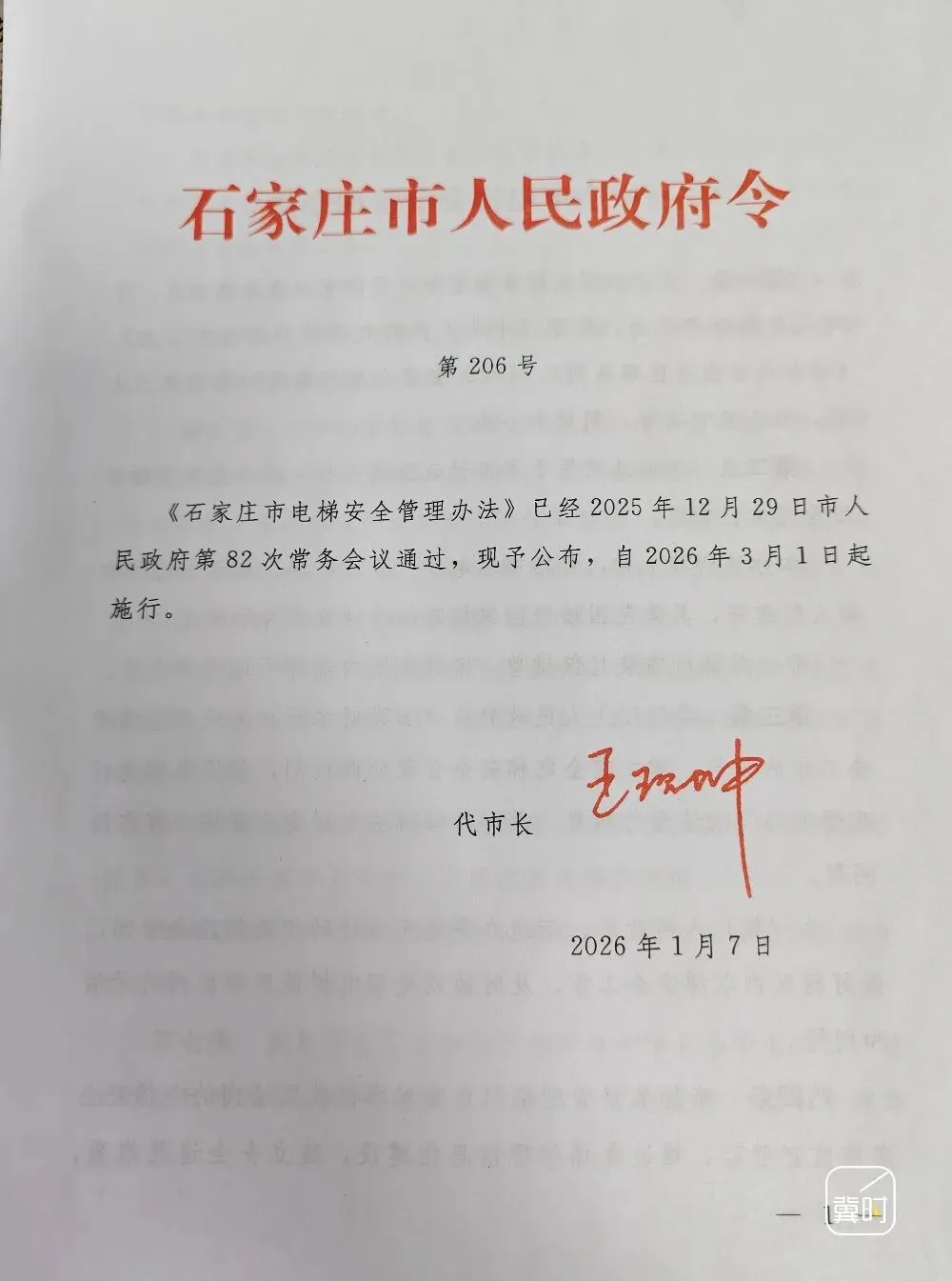 河北省石家庄市人民政府第82次常务会议通过《电梯安全管理办法》,2026年1月7日石家庄市人民政府令第206号公布,自2026年3月1日起施行。