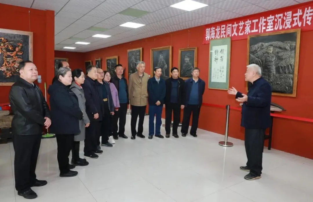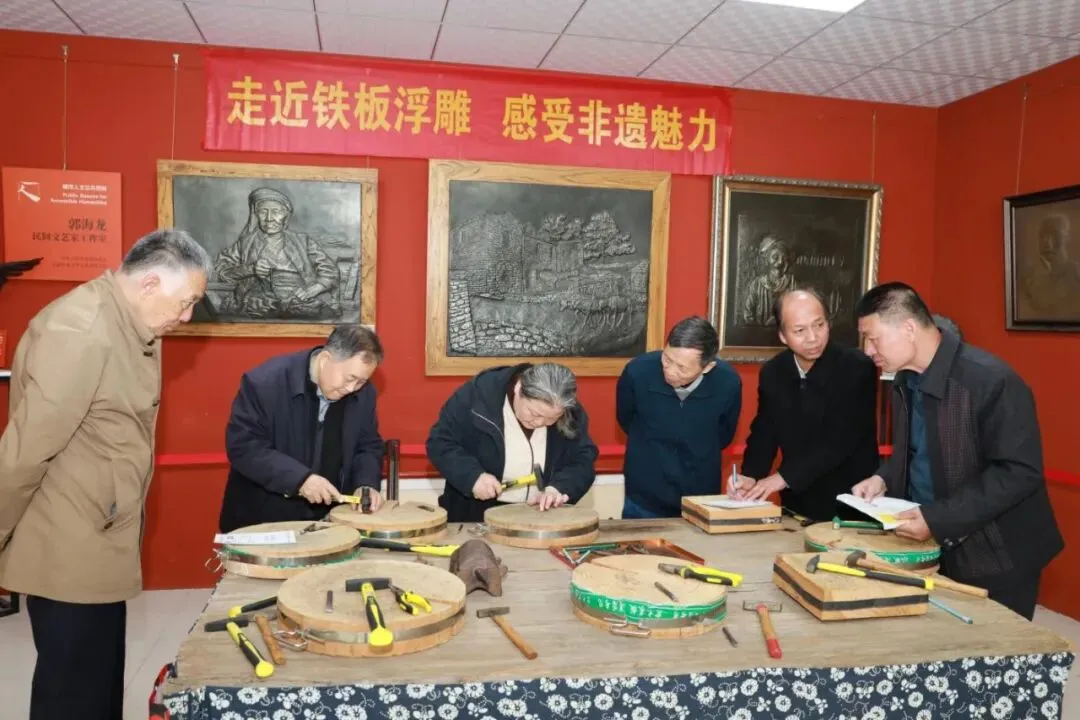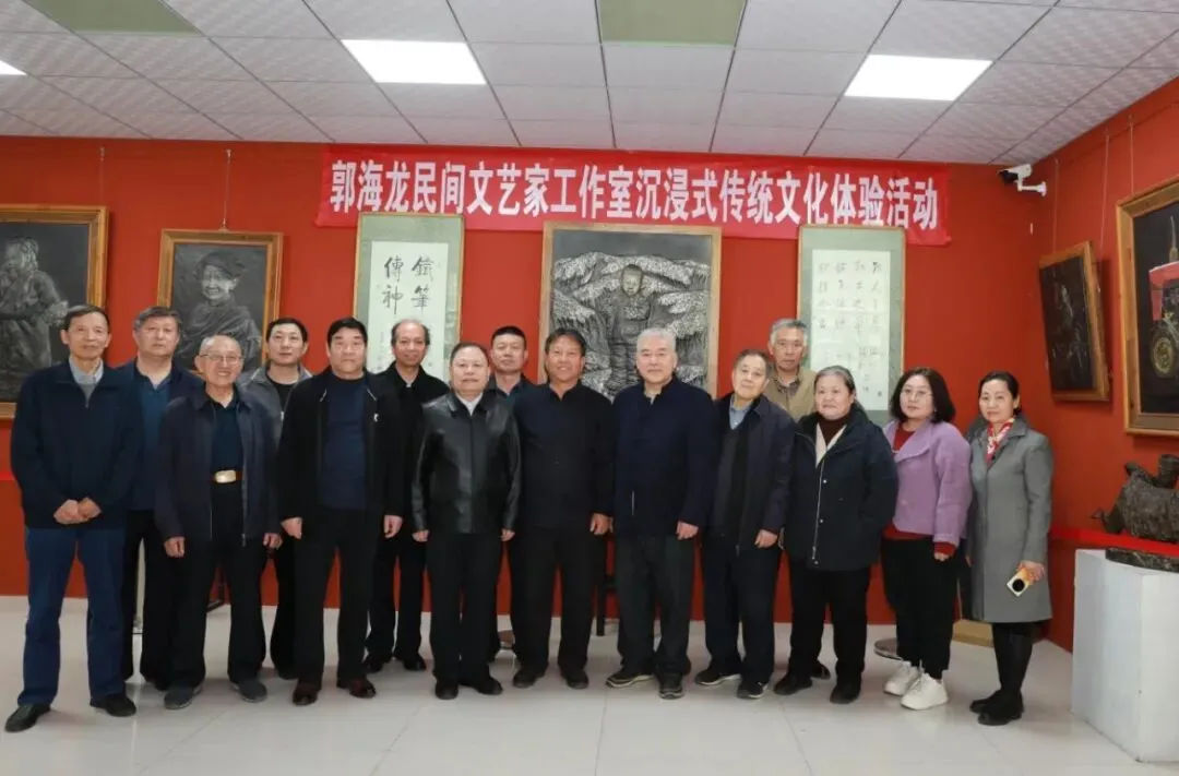 会议期间,一场别开生面的艺术之旅将气氛推向高潮。“河北大工匠”郭海龙老师亲自带领新华区书画老师们参观铁板浮雕博物馆。这位了不起的工匠大师,一双长满老茧的手,既拿得了焊枪,又绘得了丹青。三十余年如一日,他以锤为笔、以铁为纸,在冰冷的金属上一锤一錾敲出了温度,敲出了中国独一无二的“郭氏铁板浮雕”。书画界的泰斗启功先生曾为之折服,欣然题下墨宝——“铁笔传神”。这四个字,正是郭海龙工匠精神最生动的注脚。