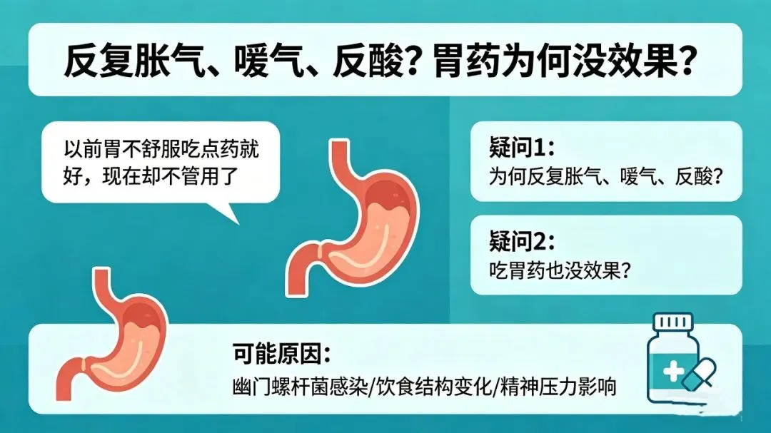 这类对话很常见,以前胃不舒服吃点药就好,现在却不管用了。不少人都有疑问:为何反复胀气、嗳气、反酸?吃胃药也没效果?下面我们详细解答。