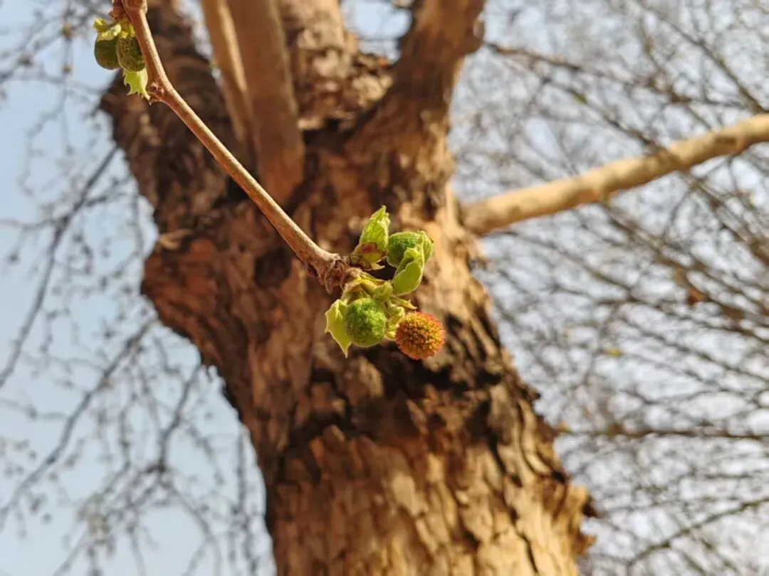 法国梧桐,又称悬铃木,是球状花絮,雌花为红色,雄花为绿色。花粉来自于雄花,花粉量很大,可以随风飘散在空气中。如果仔细观察,可以在法桐树下看到黄色的花粉。