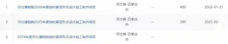 离谱的是,这已经不是这家公司第一次拿下这个项目了——2024、2025、2026,连续三年,河北博物院这个临时展览设计施工项目,年年都被它收入囊中。
