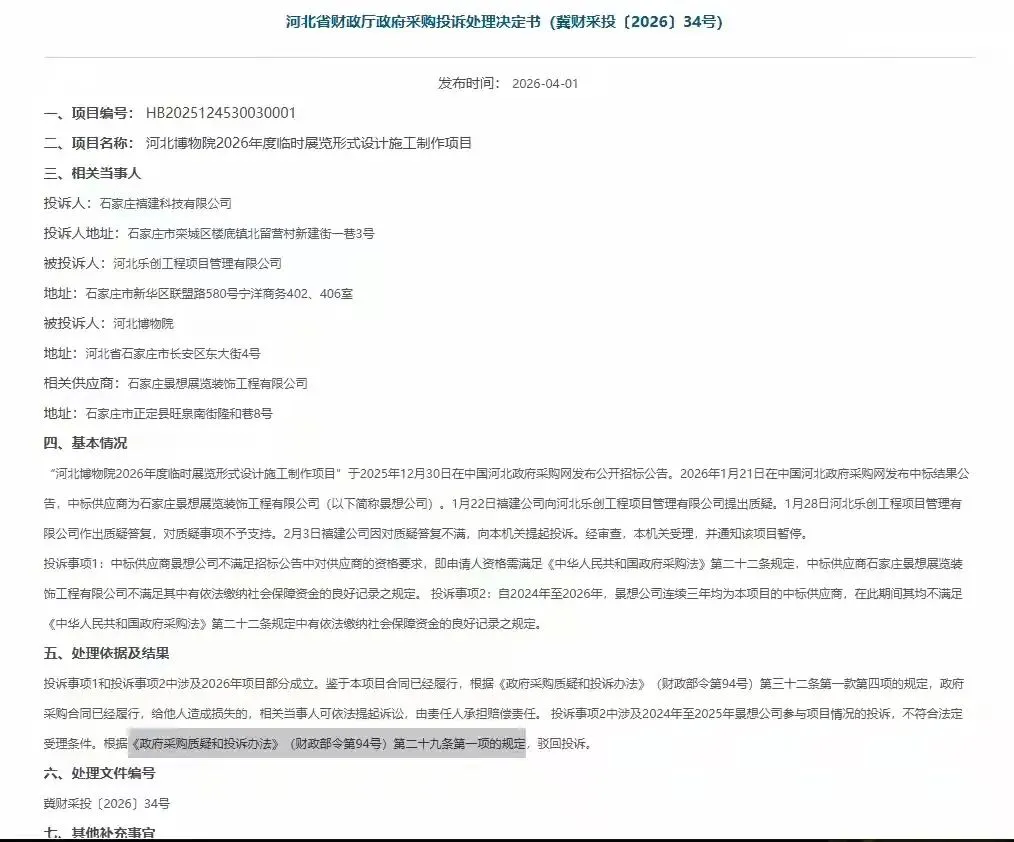 2026年4月1日,河北省财政厅一纸政府采购投诉处理决定书(冀财采投〔2026〕34号),把河北博物院2026年度临时展览形式设计施工制作项目的猫腻,扒得明明白白。