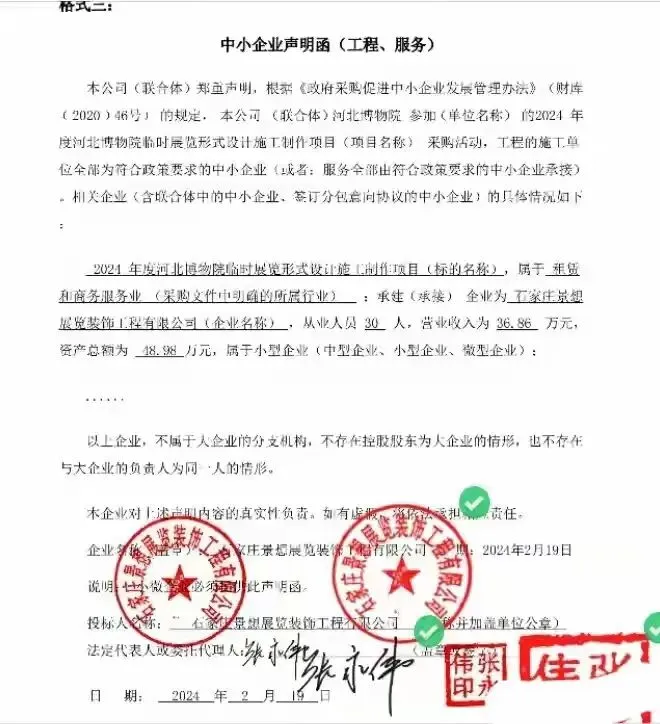 更魔幻的是,它还年年提交中小企业声明函,声称自己从业人员30人、营收几百万,属于小型企业,一路绿灯享受政策便利。