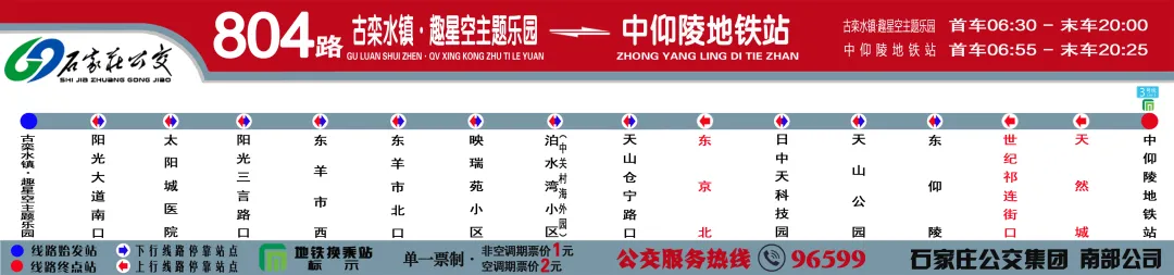 【运行区间】:古栾水镇·趣星空主题乐园(首车6:30,末车20:00) ~ 中仰陵地铁站(首车6:55,末车20:25)【票制票价】:单一票制·非空调期票价1元,空调期票价2元;各类免费乘车证卡有效。