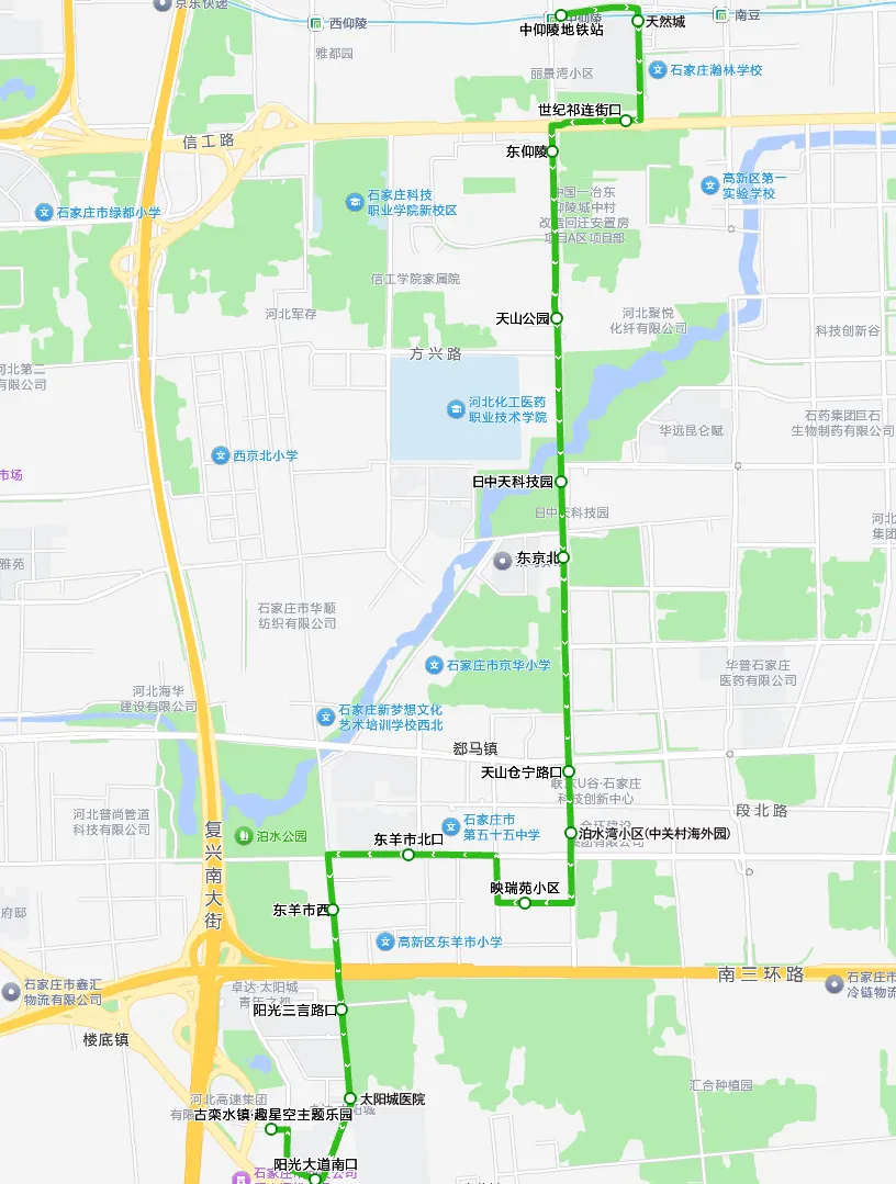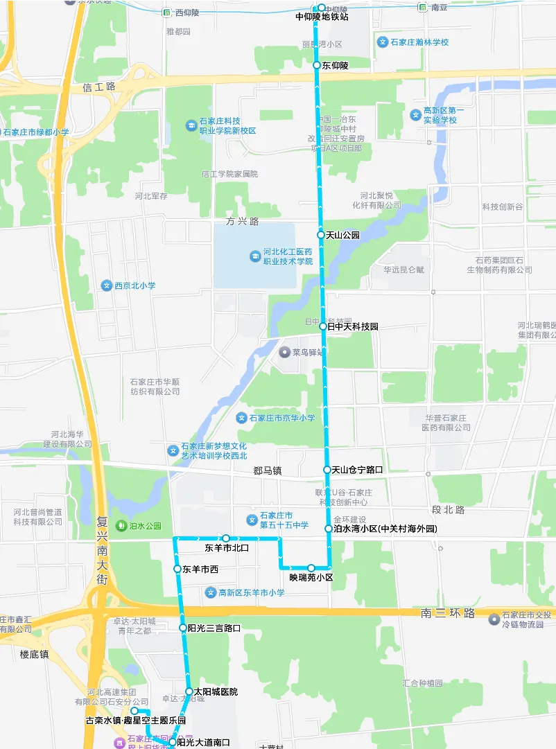 塔北路:中仰陵地铁站、祁连街:天然城、信工路:世纪祁连街口、天山南大街:东仰陵、天山公园、日中天科技园、东京北、天山仓宁路口、泊水湾小区(中关村海外园)、东佐路:映瑞苑小区、东羊市大街:、杨信路:东羊市北口、冶羊路:东羊市西、阳光大道:阳光三言路口、太阳城医院、星光大道:阳光大道南口、内部道路:古栾水镇·趣星空主题乐园