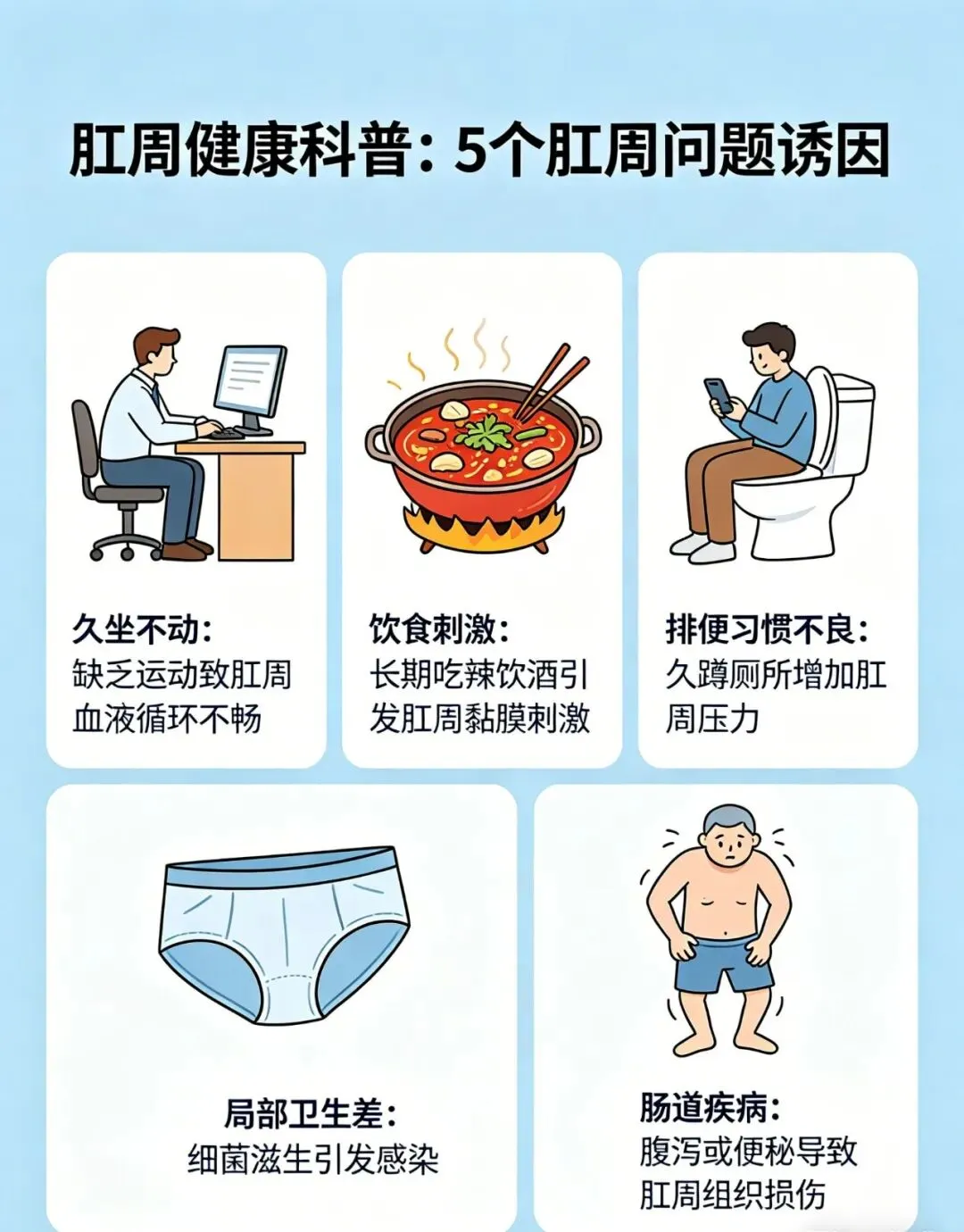 不管是天天伏案办公的打工人、长期开车的司机,还是久坐学习的学生,又或是被便秘反复困扰的人,肛周健康都很容易被忽略。有一种常见的肛周问题,看似突然发作,其实大多是生活习惯一点点 “攒” 出来的。今天就说说最关键的 5 个诱因,早知道就能少踩坑。
