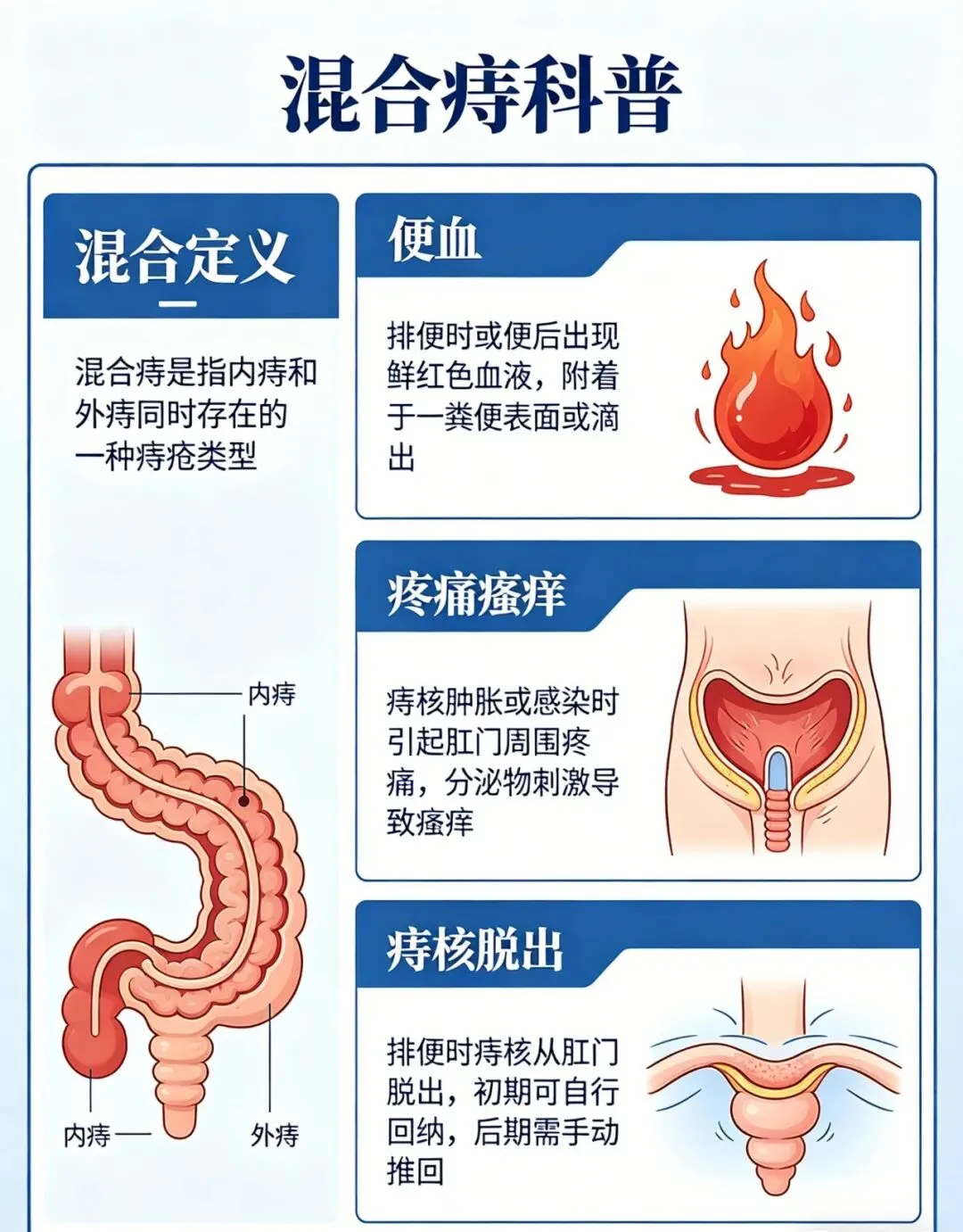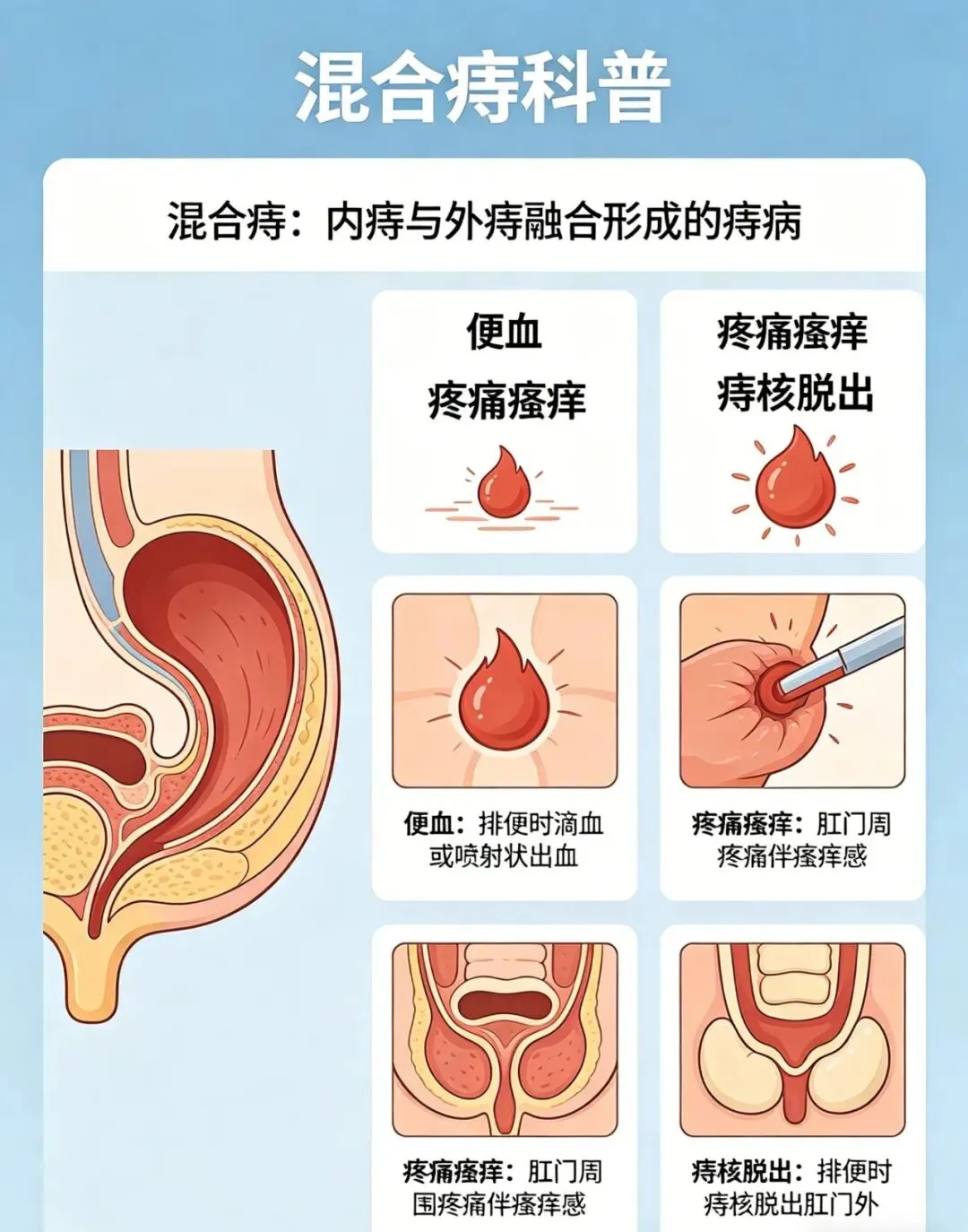 它是肛门同一位置,上下两部分痔体连在一起形成的整体,同时带有上下两种痔的特点。肛门里有一条重要分界,线上是内痔区域,线下是外痔区域。当上下两处的血管团变大、曲张,彼此连通,中间的分界沟消失后,就形成了这类痔。因为是 “合二为一”,它的表现更复杂,让人难受的情况也更多。