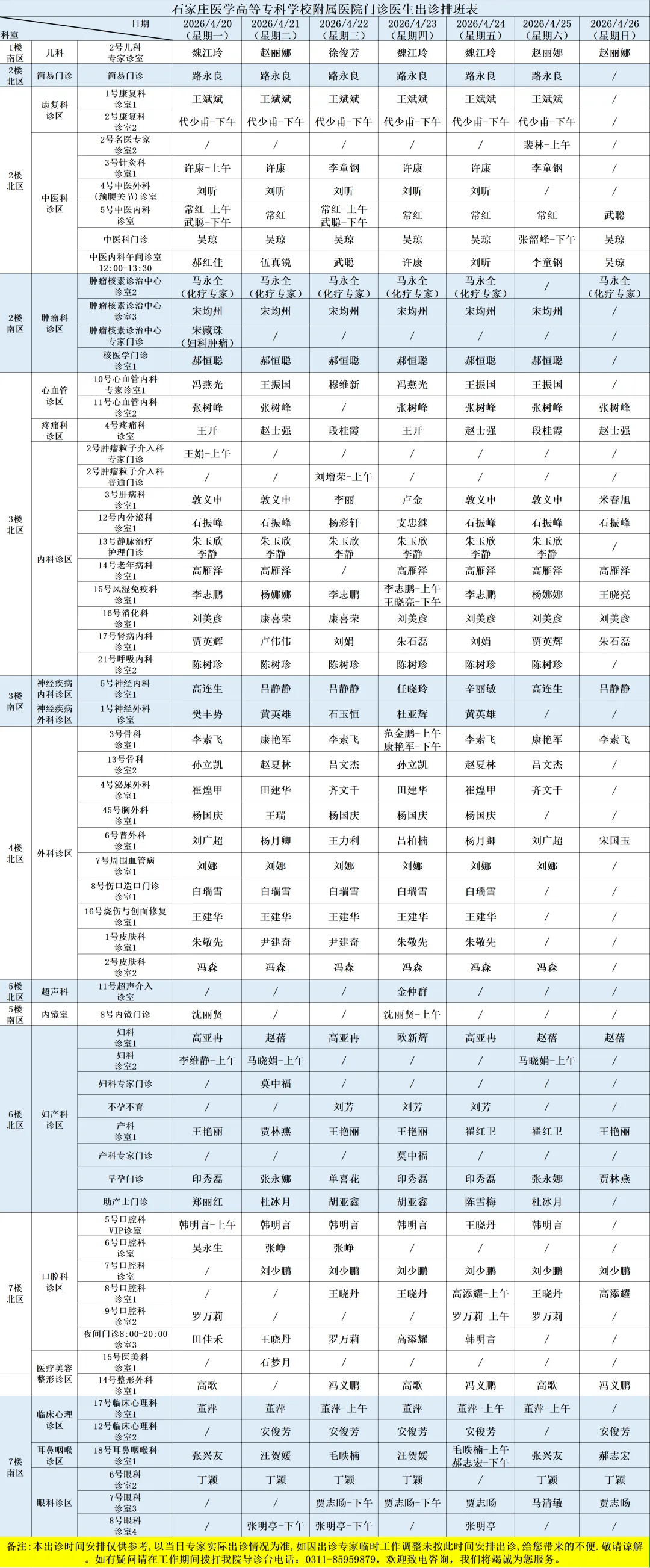 医院开设预防保健科、内科、外科、妇产科、儿科、眼科、耳鼻喉科、口腔科、皮肤科、医疗美容科、肿瘤科、急诊科、重症医学科、康复科、麻醉科、医学检验科、病理科、医学影像科、中医科等50余个一、二级临床、医技科室,能够完成疑难、危重患者的多学科综合治疗。