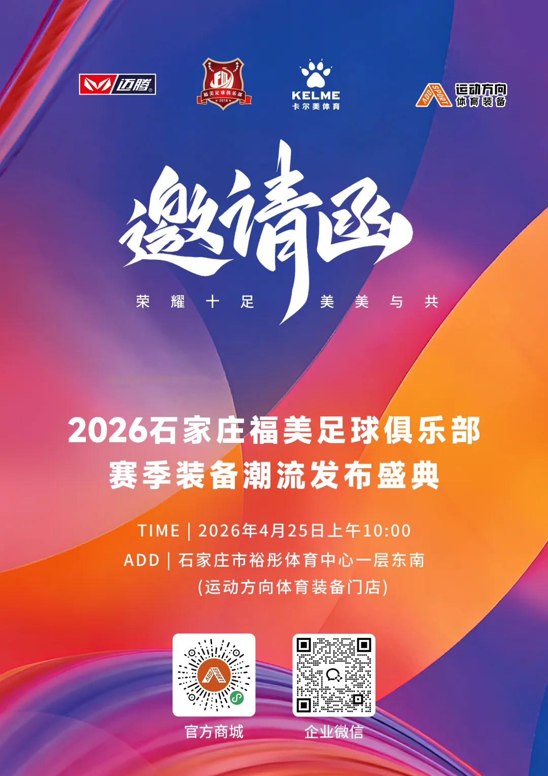 4月25日(周六)上午10:00,福美足球俱乐部新赛季启动仪式暨全新比赛服发布会,将在「运动方向」体育装备卖场热血开启!🎤 现场直击: