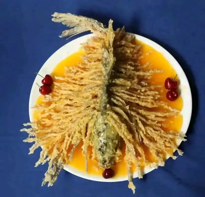 刀起。鱼肉被片成薄片,再切成细丝,鱼皮却不断。拍上淀粉,入油锅一炸,"滋啦"一声,鱼肉根根竖起,真像一头怒发冲冠的雄狮。
