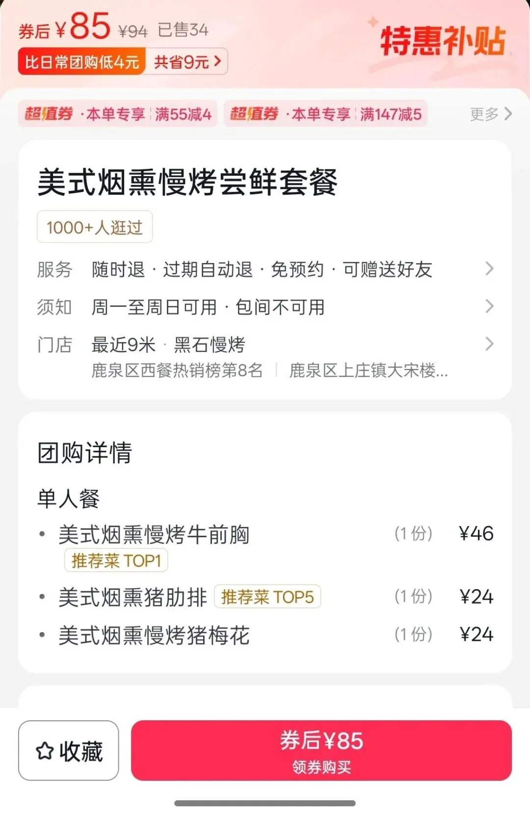 今天的文算是一篇少有的吐槽文,所以我就不点名了,也不放门头了(我这次确实记得拍了……)。一进门就给人眼前一亮的感觉,餐桌摆的错落有致,环境让我对这顿饭有些期待。上下三层,面积很大,说是顶层还有露台,适合烧烤,这要是属于我和朋友的乌托邦多好,忽然想起一部老片《奋斗》,据说现在文章的面馆很火……我进门的时候看他们在门口支了小炭炉,应该是烤给自己吃,我就问烤串卖不卖,然后来了两串牛肉串,12R……串不算小,有炭火的香气,总体还可以,所以我更期待正餐。肉上桌的时候其实有点小失望,百元套餐的量确实不大,看上去也没有那么诱人……吃的时候更失望,牛前胸和猪梅肉过于软烂,汁水不足;猪肋排入口又有些干,而且味道不足。猪梅肉甚至用叉子挑不起来,一碰就会碎……当然,不是肉的质量问题,完全是火候技艺的事。也可能不是周末人少,所以肉经过反复加热导致的,总之,我不满意。这份一百元的团购烤肉,对我来说,确实不尽人意,完全没有达到我的预期,毕竟这个价格已经可以吃一顿美式烤肉自助了,然而……走的时候有一个小插曲,吃完饭我脑子里一直在想要怎么写这篇测评,我记得我是团购的,所以很自然的和小哥打了个招呼,就走了……然后出门没走多远就被叫住了,忘了结牛肉串的钱,略显尴尬。结账的时候我扫了眼堆着的结账单,然后抖音搜了一下。和大众完全不同的标价,但我理解应该是同样的东西。我不知道这是大众的问题或是商家的问题,虽然没说什么,只是心里总归有些不舒服,感觉有点儿戏……当然,也有我的问题,一个是没有比价,一个是进店没有看菜单。这顿饭不算是舒心的一餐,所以就不做总体点评和打分了。但是有一说一,它家这个环境真的很戳我,如果是为了打卡出片,真的可以来,但是美式烤肉我实在没法推荐……临走的时候送了我两张优惠券,消费送价值38元汉堡,但是团购标价是40啊亲,所以团购价格真的只是说说而已嘛……有些槽点确实是不吐不快,不过夏天我如果还住这边,可能还会去打卡尝尝他们家的烤串,毕竟我喜欢这个环境,也喜欢炭火烤串的滋味,如果到时候有不一样的体验,我再分享给你们……