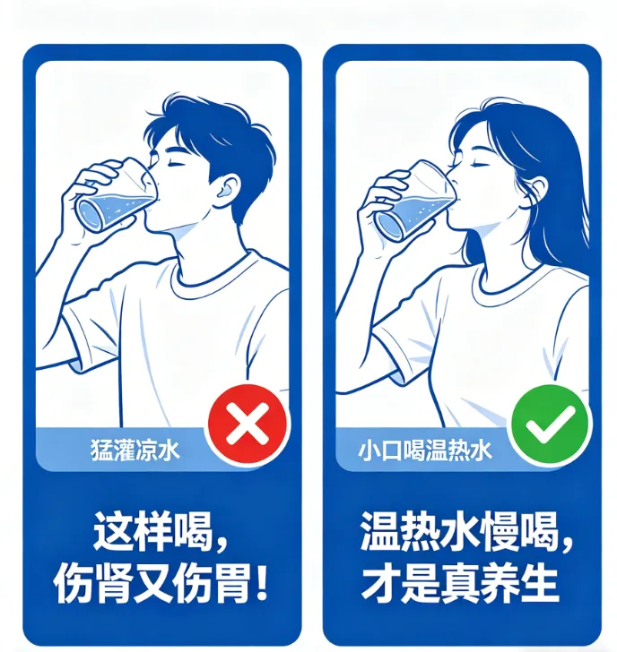 第一种:**猛灌一大杯冰水/凉水**。好多人早上起来口干舌燥,直接从冰箱里拎出水就喝,或者接杯自来水凉水,觉得那叫一个爽!但咱的肠胃经过一夜休息,还处于“迷糊休眠”的状态,凉水猛地灌进去,一下子就刺激到肠胃黏膜了,容易胃痉挛、拉肚子;而且肾脏一下子要处理这么多凉水,负担也会加重,长期下来真的伤肾又伤胃,太不值当了!